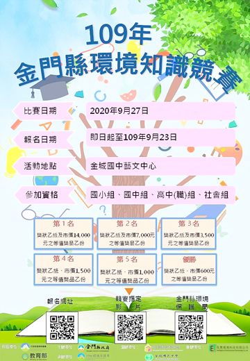 「109年金門縣環境知識競賽」報名將於本(9)月23日(星期三)截止,目前社會組尚有名額,本縣環保局歡迎各路環境知識達人趕緊把握最後機會參賽;各組成績前10名者可獲頒獎品及獎狀,前5名更能代表本縣進軍全國,與全國各縣市好手同場競技角逐最高榮譽及獲得最高3萬元獎金。報名網址:https://ppt.cc/fVPrCx。 環保局指出,109年金門縣環境知識競賽將於本(9)月27日(星期日)上午8時至下午5時,於金城國中藝文中心辦理,競賽方式採「淘汰賽」及「驟死賽」二階段辦理,競賽題目依環境教育八大領域與環保時事、日常知識、環保政策及指定影片等進行題目設計,競賽指定影片,可至環境教育終身學習網(https://elearn.epa.gov.tw/DigitalLearning/arena.aspx)觀看,各組別前五名優勝選手,將代表金門縣參加11月14日全國總決賽。 環保局表示,透過競賽方式推動環境教育,可使民眾主動關心環境時事並從大自然學習知識,增進學生及縣民的環境素養,提升認真探索及主動學習的精神;期望將知能化為行動,實踐環境保護責任。如對於活動有相關疑問,可洽詢活動聯絡人:詹怡儒小姐,電話:082-337483、0966-611199。