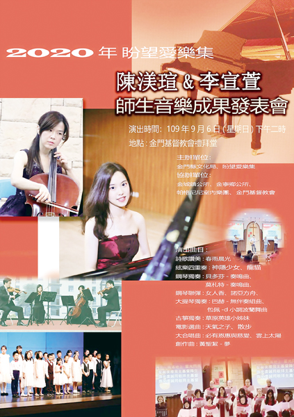 一場由「盼望愛樂集」團長資深音樂老師陳渼瑄,與「帕格尼尼室內樂團」團長李宣萱老師,共同帶領一群音樂新生代的音樂會,將於今日下午二時假金門基督教會禮拜堂展開「2020盼望愛樂集.陳渼瑄、李宣萱師生音樂成果發表會」,歡迎民眾就近聆賞。 活動中將邀請「金門弦樂四重奏」、金門教會「恩泉詩班」、金門教會「敬拜團」一起演出。音樂會中將演出世界名曲,還有數首出自金門學子的創作曲和改編曲。演出者的年齡層跨越幼兒園到大學,期待讓聽眾們聽到不一樣的音樂表現。 特別提醒鄉親,金門教會是「宗教場所」,同時是本場演出的「展演場所」,前來聽音樂會請「務必戴口罩」。