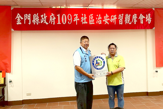 金門縣109年度社區治安研習觀摩活動昨日上午在金湖鎮新頭社區牽罟班活動室前廣場熱絡展開,參議陳世保代表縣長楊鎮浯頒獎表揚本縣109年標竿社區新頭社區,及本縣108年度社區治安營造績優人員新頭社區守望相助隊陳君平,現場並由警察局、消防局、社會處等單位進行業務宣導,還有消防局金湖分隊在現場進行消防救災實作演練,以及社區防救知能、社區老人照(保)護以及反詐騙、反毒品犯罪預防等宣導課程,藉由相互觀摩學習,以深化社區組織自我防衛能力,建立自我解決治安問題能力,建構安全的社區環境。 昨日活動在社區志工所組成舞蹈隊活力舞姿表演中展開序幕,縣府參議陳世保、民政處長蔡西湖、金湖鎮長陳文顧、陳玉珍立委服務處主任林孫全、金湖分局長黃維章……等貴賓列席,參加人員還有縣府社區治安團隊,各鄉鎮社區守望相助隊成員,及社區發展協會成員總計約200人參與活動,相互交流。 縣府參議陳世保分別頒發榮獲內政部109年度標竿社區-新頭社區守望相助隊,及本縣108年度社區治安營造績優人員 陳世保致詞時表示,感謝新頭社區及相關單位用心籌劃本次的社區治安研習觀摩活動,以及平日為社區治安工作默默耕耘,貢獻心力的工作夥伴。今年新頭社區守望相助隊首次代表本縣角逐全國「社區治安-標竿社區」,就一舉獲得內政部認證,實屬難得。 他也對於本縣社區治安團隊,能建立多元合作夥伴關係,暢通協調聯繫機制及輔導社區永續經營深表讚許。他指出,警力有限,社區的治安端賴全民的共識和參與,才能維護社區的和諧。金門以往是農村型的社會,展現守望相助的互助精神,隨著社會的變遷和開放,觀光人口的導入,也衝擊著社區的治安問題,唯有居民有著維護生活家園的共識和付出,發揚傳統敦親睦鄰美德,積極投入協助維護治安行列;結合社區警政工作,建立警民「夥伴關係」,以服務為導向,加強警察與民眾間互動聯繫並針對社區內各種問題共謀對策或解決之道,以達成強化民眾自我防衛體系之力量,共同努力來建構安全社區。 金湖鎮鎮長陳文顧也在會中讚許新頭社區是金湖鎮目前唯一有守望相助隊的社區組織,社區齊心為治安付出努力,並獲得豐碩成果,他也感謝平時默默為社區治安付出心力的夥伴,也期望未來各社區都能陸續成立巡守隊,有更多熱忱的鄉親投入維護社區治安工作。並指出,「社區安全」為政府現階段的重點工作之一,警政、社政、民政、消防等相關單位應全力啟動,並善加運用村(里)及社區人力資源,共同推動社區治安工作,連同社區民眾一起來拼治安,確保社區、居家生活安全,強化社區自我防衛能力,建構優質、安全的社區環境。 金湖分局分局長黃維章表示,今年受新冠肺炎疫情影響,本縣警察局及各相關部門利用電子媒體加強社區治安宣導,疫情解封後更深入各社區辦理社區治安會議,加強犯罪預防宣導,強化反毒、反詐騙、防災及婦幼安全宣導,鄉親也反映意見給各政府相關部門,使民眾關心的問題獲得解決,這些都是本縣建立社區安全網及健康幸福城市,極為重要的工作之一。 昨日活動結合警政、消防、社政及新頭社區等,推出多項課題,並邀請警察局、消防局、環保局、衛生局、社會處等進行業務宣導,使觀摩活動內容豐富與多元化。而消防局金湖分隊在現場進行消防救災實作演練,藉由演練強化防災的觀念與災害緊急應變能力。實作演練後,由新頭社區人員與縣政府社區治安輔導團隊帶領實施「社區環境檢測及導覽」簡介,本縣各社區、守望相助隊及警政、消防、社政等人員,前往新頭社區進行治安環境踏勘,觀摩新頭社區各項執行成效。 接續的研習活動則邀請消防局科長林俊、社會處社工林若琳、刑警大隊組長楊智美分別講授「社區防救知能及自救能力提升」、「社區老人照(保)護議題」及「反詐騙、反毒品犯罪預防宣導」等課程,藉由研習課程相互學習觀摩,以深化社區組織自我防衛能力,建立自我解決治安問題能力。