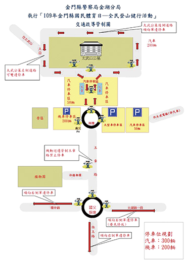 金門縣立體育場將於9月5日上午在太武山舉辦「109年金門縣國民體育日全民登山健行活動」,為因應活動可能帶來之人潮與車潮,金門縣警察局金湖分局屆時將於太武圓環、玉章路、太武公墓、屏東文康中心及周邊道路實施交通疏導管制,以維道路之行車順暢及人車安全,並呼籲前往參與之民眾及行經該路段之駕駛人配合員警或義交人員之指揮。 全民登山健行活動周邊道路交通疏導管制措施如下: 一、太武山停車區部分: (一)停車區部分:太武公墓周邊道路已協調金防部於當日上午7時起開放汽車停車,太武公墓前方廣場為汽車停車區。面對天地正氣牌樓右方為遊覽車(兼為接駁車上下車處)及汽車停車場,左方為機車停車場。 (二)交通管制部分:太武公墓周邊道路為單向通行。太武公墓前方廣場中央花臺路段禁止停車,玉章路(天地正氣牌樓至太武圓環路段)全線禁止停車。 (三)如規劃之停車區域均停滿,則於太武圓環(國父銅像)處管制車輛進入。開放車輛於太湖路一段、伯玉路及環中路等路段靠右單邊停車。 二、屏東文康中心停車區部分: (一)停車區部分:文康中心內廣場為汽車、機車停放區,公車候車亭處為接駁車上下車處。 (二)活動當日如文康中心內停車區均停滿,則開放車輛於高陽路往文康中心路段及文康中心往環島東路路段靠右單邊停車,屆時文康中心周邊路段改為單向通行。 金湖分局分局長黃維章表示,全民登山健行活動,歷年來參加人潮眾多,為使交通順暢,故派員實施交通疏導措施,相關之交通疏導管制措施可於金門縣警察局金湖分局網頁及臉書上查詢,請出遊民眾事先上網查看,汽、機車駕駛人請聽從警察人員之引導停放車輛,以維持交通之順暢。