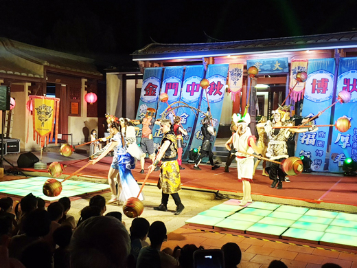 一年一度的中秋節即將來臨了,「十二生肖」下凡來同樂,來與大家一起中秋博狀元餅。金門縣政府宣傳中秋博餅活動,邀請「藝想臺灣劇團」演出「十二生肖│時來運轉」,十二生肖們詼諧演出,逗得現場觀光客哈哈大笑;演出結束後,現場小朋友紛紛搶著要與喜愛的動物合影留念。 「十二生肖│時來運轉」表演,在開始前還由表演者敲鑼打鼓上街攬客去,十二生肖扮相讓人不免多看一眼。表演活動開始後,由嫦娥仙子與手下玉兔介紹動物們出場,十二種動物各顯神通展才藝,過程中特地邀請台下觀光客上台互動,來一場笑翻大家的凌波舞,劇團最後還編排十二生肖藝陣,重現傳統廟會文化,整段演出精彩連連,毫無冷場。 這場「十二生肖│時來運轉」演出,是金門中秋博狀元餅的系列活動之一,今(星期五)到九月六日(星期日)的每天晚上七時到七時三十分左右,還會有三場表演,金門縣觀光處歡迎民眾踴躍前往欣賞,感受一下劇團的魅力。