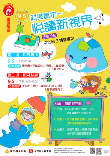 你知道被路燈的黃光照射的障礙物,障礙物背後只會產生黑影,並不會出現黃色影子?為什麼有時候障礙物背後有好幾個影子呢?你知道為什麼有些影子具有顏色?金門縣立圖書館為推廣與培養閱讀習慣,將於9月5日(星期六)於文化局三樓會議室上午、下午各舉辦一場兒童、青少年「科學實作~悅讀新視界」活動(見活動海報)。即日起於文化局縣立圖書館(南棟)接受報名,額滿截止。活動洽詢專線:082-323169轉172。 活動分為上午場九時至十二時,下午場二時至五時。上午場次為國小三年級以上之兒童、青少年報名參加,共八十個名額,下午場次為親子組,共四十組,參加對象為幼幼班至國小二年級及家長。報名方式可採現場及電話報名,現場報名於現場借閱十本書,即可填寫資料,完成報名手續;電話報名之後再請讀者前往縣立圖書館補借十本書,即可完成報名。 活動特別商請謝甫宜老師擔任講座,謝老師為高師大科學教育研究所博士,目前任教高雄市陽明國中自然科教師、遠哲基金會活動講師,2012年物理教育教學獎得主,也是創意社群推手,擔任「科學遊戲種子教師」之講師,非常喜歡分享饒富趣味的科學教育。 本次「科學實作~悅讀新視界」活動,謝老師要帶給讀者三個課程主題:「形形色色的光與影—光的三原色與繽紛的彩色光影」、「螢光繪圖藏玄機—紫外線變色材料繪製圖像與藏字」、「欲窮千里目—三原色會聚白光與伽利略望遠鏡原理」,帶領孩子們進行多項好玩又有趣的「光學」實驗。 金門縣立圖書館推薦以下幾本公認寫得最好又最暢銷的科普叢書,包括:《數理化通俗演義》、《電學之父-法拉第的故事》、《十種物質改變世界》、《什麼才是真的?》另外,館內也有許多關於科學的書籍及雜誌,例如:《WOW!不作手會癢35個有趣的科學實驗》、《天天在家玩科學》、《圖解科學大驚奇2》、《圖解科學大驚奇3》、《玩出創意1:50個魔法科學實作》、《玩出創意2:120個創新科學遊戲》、《玩出創意3:77個奇趣科學玩具》、《玩出創意4:55個玩悅科學實驗》、《STEAM科學好好玩》、《創意科學實驗365》等書籍,其他還有《新小牛頓》、《未來少年》、《少年飛訊》等雜誌,都很歡迎兒童、青少年朋友前往圖書館借閱。 金門縣立圖書館特別提醒大家,為配合中央及金門縣政府防疫措施,參與活動應佩戴口罩,肥皂勤洗手,若有出現發燒、咳嗽或呼吸急促症狀,請來電取消報名,後續還會有其它閱讀推廣活動,請大家隨時關注「金門閱讀島」粉絲專頁查詢。