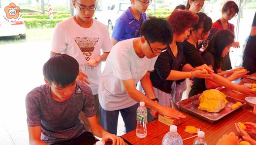 一場以港澳青年學生為對象的「港澳學生金門體驗營」,昨(八)日在主辦單位的安排下,於水試所旁的天后宮體驗傳統的「紅龜粿」的製作,首次接觸到這類傳統糕點的製作,也讓這群來自香港的大學生直呼「很有趣」。 社團法人金門縣青少年暨兒童關懷協會辦理「二○一七年港澳學生金門體驗營」,來自香港地區的大學生們,從六月五日透過小三通模式跨海來到金門,進行為期六天五夜的在地體驗活動。 昨日下午一點開始,主辦單位特別邀請志工媽媽們協助,於天后宮前的廣場,指導這群來自香港的年輕朋友們,製作「紅龜粿」,在志工們的解說與引導之下,每位學生揉捏著以地瓜為原料的麵皮,包入花生粉之後搓揉成圓球,放入模印按壓成型,當學生輕敲模具後看到成品的誕生,各個無不驚奇。 同樣也前往擔任志工的議員唐麗輝表示,這次的活動,主要是希望港澳學生了解金門當地的文化風俗,幾天的活動,讓他們體驗到戰地文化、金門的風俗民情、餐飲習慣,活動規劃安排上,將金門的風俗與傳統文化融入食衣住行方面,未來也希望將這樣的深度體驗的方式融入旅遊當中。 第一次看到「紅龜粿」的製作,來自香港中文大學的陳同學說,在香港雖然沒有這種點心,但是也有稱為「粉粿」的點心,內餡同樣包著花生,但是外皮卻是白色,而紅龜粿特別的是外觀有著不一樣的圖樣,很特別。 六天五夜的行程,昨日是第五天了,陳同學說,他是第一次來到金門,在他的印象中金門應該是要很鄉村,但實地走訪後,發現金門與香港不同的是,可以隨時隨地接觸到大自然,但是整體的生活機能卻也十分便利,有許多的雜貨店、便利商店,但是卻也被許多樹木所包圍著。 六天五夜的活動規劃多元,學生們參訪金門酒廠、剝蚵體驗、防身術、漆彈作戰;鄉野探險則包括古道尋奇、探索島上碉堡文化遺跡、金門最高峰「太武山」人定勝天石;參訪觀光陽翟老街講古及金城城區闖關等。