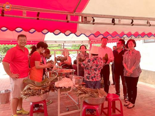 慶祝端午佳節到來,盤山社區昨日提前舉辦端午節包粽子活動,社區發展協會理事長翁自然、村長翁明海、鄉代表翁明惠帶領社區志工媽媽一起動手包製味美新鮮的肉粽與社區樂齡長輩享用,並分送社區關懷據點獨居老人,向他們賀節,提早歡度過了一個充實溫馨的端午佳節。 金寧鄉盤山社區歡慶端午節活動在社區發展協會理事長翁自然、村長翁明海、鄉代表翁明惠帶領下,在盤山村辦公處舉行「粽葉飄香」包粽趣活動,縣府參議許寬、秘書李文俊、金寧鄉長陳成勇、金寧代表會主席陳成泉、副主席李開陣、縣府社會處科長董燕輝、鄉公所課長蔡世舜以及立委楊鎮浯辦公室副主任洪學文、翁克強等人也到場慶賀,致贈高粱酒、加菜金、礦泉水增添喜慶氛圍,福建省政府秘書長翁明志也出席和鄉親一起感受端午節的熱鬧溫馨氣氛。 社區婆婆媽媽在樂齡老師的指導下,以傳統的手法包製肉粽,大家分工合作,有的負責準備配料,有的包粽,炒熟香菇、蝦米,再以粽葉將滷肉、蛋等一起包入後蒸煮,一串串粽子高掛在架子上,現場香味四溢,大家臉上洋溢著笑容,到場的嘉賓與居民一起享用香噴噴的肉粽與麵線湯,大家吃得津津有味,充滿著端午節的歡樂氣氛。 翁自然理事長表示,端午節到來,社區結合金寧鄉樂齡團隊辦理這項「粽葉飄香」活動,除了傳承民俗技藝,讓長者回味、比較一下現今粽子與以前粽子用料與蒸煮方式的差異,並辦理關懷據點的供餐、送餐,及慰問社區獨居老人,同時也藉由活動鼓勵樂齡老人走出家裡參與社區活動,一起來關心社區發展,增添活動的熱鬧氣氛。