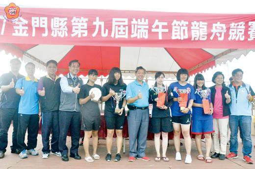 金門縣第九屆端午節龍舟賽昨日假古寧頭雙鯉湖畔展開競技,計有社男組、社女組、鄉鎮組共二十九支隊伍競技,比賽結果由金門農工囊括社會男、女子組冠軍;鄉鎮組由地主金寧鄉隊連續四年稱王。副縣長吳成典代表陳縣長頒獎獎勵優勝的團隊,並和選手們相約「明年再見」。 這項競賽於昨日上午九時起展開,在縣長陳福海、議長洪麗萍、議員歐陽儀雄、金寧鄉長陳成勇、金城鎮長石兆瑉、金湖鎮長蔡西湖、烈嶼鄉長洪成發、金門縣體育會理事長李金贊等來賓共同鳴槍後,男女選手分組進行三十場次競賽,距離為三百公尺。各隊選手為爭取佳績,莫不卯足全力往前划,展現運動員的精神。選手成排跨坐於兩側,奮力持槳划動,練習團隊默契與持槳觸水的手感,配合隆隆鼓聲,在水道上賣力划槳、接近終點時,觀眾的加油聲,也讓選手一鼓作氣的衝刺,爭取團隊佳績。 整個賽事於下午四時落幕,各組的成績為:(一)社男組:第一名,金門農工A隊。第二名,金門農工B隊。第三名,金酒公司。第四名,金門縣政府。第五名,大河國際Hero。第六名,金鯊。第七名:金門大學A隊。第八名:湊一隊。優勝:金門大學B隊、The Fulboaters、音速小子、船身破洞沈大海隊。 (二)社女組:第一名,金門農工B隊。第二名,金門農工A隊。第三名,金酒公司。第四名老校隊。優勝:金門大學、阿貓隊 (三)鄉鎮組:第一名,金寧鄉。第二名,金沙鎮。第三名,金城鎮、第四名金湖鎮。 (四)表演組有廈門大學、金門大學,中興大學、浙江大學也獲得頒發紀念獎牌獎勵。 頒獎閉幕活動於下午四時許舉行,由副縣長吳成典、縣府教育處長李文良、金寧鄉長陳成勇等人頒發獎盃、獎金予優勝隊伍,金沙代理鎮長楊志斌、金門農工校長劉湘金、金門農工校務基金會副董事長黃克標(本報經理)等人到場觀禮。吳成典稱許參賽隊所展現的團結,才能發揮最大能量,有好的佳績。並和選手們相約「明年再見」。
