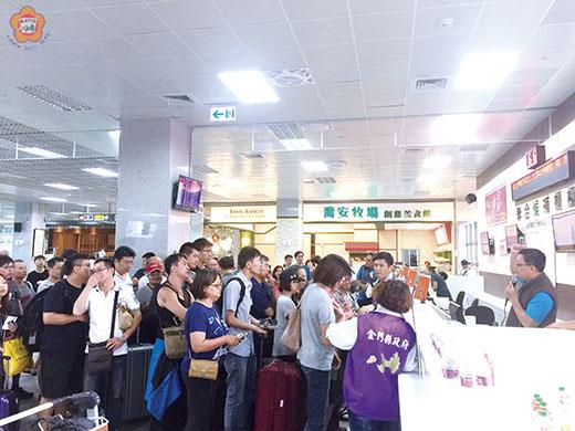 5月30日為端午連續假期收假日,中午過後金門機場即湧入候補人潮,縣長陳福海關心鄉親返回工作崗位情形,指示縣府服務團隊積極協調民航局及航空公司,於是日晚間21點25分加開臨時加班機1架次往返北金,順利協助疏運返台鄉親人潮。 4天端午連續假期昨日收假,部分鄉親陸續準備搭機回台,縣府服務團隊一早即進駐機場,協助鄉親處理搭機事宜。 直至昨日下午四點仍有近百位民眾候補機位,經縣府評估既定航班可能無法全數將民眾疏運完畢,因此立即與民航局及航空業者協調,也順利爭取到一班下午21時25分,由金門飛往台北的立榮航空班機,提供70位個座位數,全力疏運鄉親返鄉。