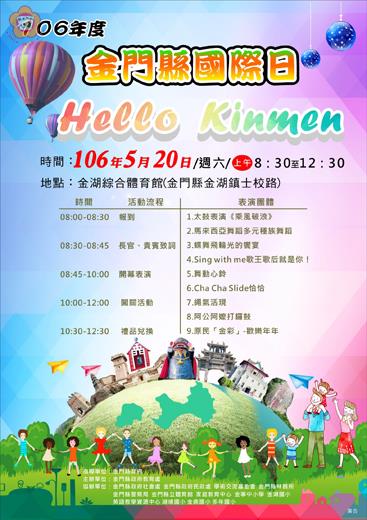 在溫馨的五月,外師即將結束本學年教學之際,為提升親師生大眾之國際觀,體會世界不同民族的文化,縣府教育處將於明(20)日上午8時30分至12時30分在金湖綜合體育館辦理106年度金門縣國際日「Hello, Kinmen!」(見圖)活動,歡迎共襄盛舉! 而藉由國際日跨文化闖關活動和多元文化與經驗的分享,縣府也希望能營造友善、具國際視野之社會氛圍,並拉近外籍教師與學生及在地居民的情感交流。 縣府指出,為提升本縣學童英語能力,教育處多年來陸續引進外籍英語教師駐各校協同教學,外師教學活潑熱情,開口說英語對本縣學童來說,已不再是難事。外籍英語教師平時對本縣的公共服務良多,圖書館說故事、金門日報專題報導、節慶活動等都可以看到他們的身影,對本縣的貢獻良多。 今年金門國際日活動現場將由金寧中小學太鼓揭開序幕,邀請多年國小獨輪車、金鼎國小扯鈴、湖埔國小跳繩等演出,另外學術交流基金會24位外籍英語教師也將帶來異國風情的歌舞表演,還有社會處的馬來西亞舞蹈、烈嶼東鄰社區阿公阿嬤打鑼鼓、金門那魯灣歌舞藝術團帶來的表演,節目琳瑯滿目,教育處希望藉由體驗世界不同民族的文化,營造多元的社會。除此之外,由教育處、家庭教育中心、英語教學資源中心、民政處、社會處等各單位提供20關的多元文化闖關體驗,報名已於日前截止,另提供200名現場報名,歡迎踴躍參與!