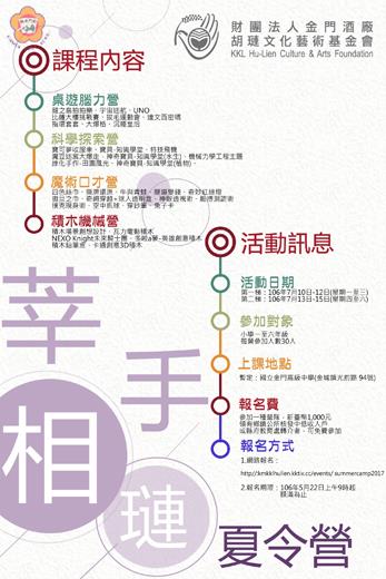 財團法人金門酒廠胡璉文化藝術基金會「莘手相璉」夏令營又來了!今年將於106年7月10日至15日辦理二個梯次,每梯次為期三天,共有「積木機械營」、「科學探索營」、「桌遊腦力營」、「魔術口才營」4種營隊供學生選擇。對象為小學一年級至六年級,每營報名費為新臺幣1000,一律採網路報名,自5月22日上午9時起受理,額滿為止,報名網址為:https://kmkklhulien.kktix.cc/events/summercamp2017。 財團法人金門酒廠胡璉文化藝術基金會,為讓學生從實際的活動與操作中,培養基本的概念與探究、解決問題的能力,透過學習的過程,培養學生主動學習與探索新的知識,度過愉快的暑假生活,今年又再度辦理「莘手相璉」夏令營,並且共計有二個梯次,每營上課人數上限30人,額滿為止,而每營報名人數未達15人,將不開班,報名費退還。活動對象為國小學一年級至六年級,上課地點暫定在國立金門高級中學,每日上課時間為上午9時至下午16時30分,每營報名費為新臺幣1000元,每人每梯次限報名一種營隊,最多可二梯次各報名一種,營隊期間會提供教材及午餐,若領有鄉鎮公所核發之中低收入或縣府教育處轉介者,則可免費參加。 財團法人金門酒廠胡璉文化藝術基金會也表示,「莘手相璉」夏令營,報名方式採一律網路報名,自5月22日上午9時起,額滿為止,詳細的課程內容,請至胡璉基金會粉絲團查詢,網址為http:// www.facebook.com/kklhulien。洽詢電話082-325628轉88492。