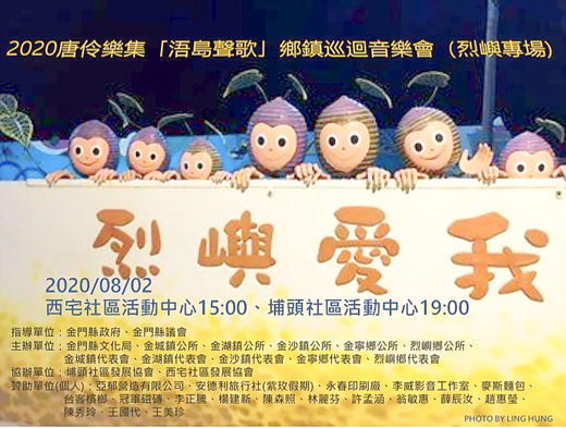今年是唐伶樂集「浯島聲歌」鄉鎮巡迴音樂會八年計畫中的第三年;即將於明(二)日亮相的烈嶼專場,也是唐伶樂集繼前年烈嶼鄉青岐場演出後,再度跨海踏上小金門演出巡迴音樂會活動,歡迎各界藝術愛好者在二日前往烈嶼觀賞,給予唐伶樂集最大的支持和鼓勵! 唐伶樂集今年的「浯島聲歌」鄉鎮巡迴音樂會開跑,適逢二○二○父親節前夕,格外有意義!烈嶼專場也與烈嶼鄉西宅社區、共同舉辦,第一場演出將在八月二日下午三時於西宅社區活動中心演出;晚間在埔頭社區活動中心演出第二場次,歡迎在地鄉親到場聆賞和共襄盛會,共渡周日美好時光! 唐伶樂集表示,「浯島聲歌」鄉鎮巡迴音樂會烈嶼專場,很榮幸邀請到金門地區聲樂界超級元老退休校長林水綠,參與此場音樂會演出;還有中生代的洪鳳英(美聲)、陳婉晴(小鄧麗君)、許宇寰(龐克搖滾)和新生代的李依蕎(抒情歌曲)、劉俐瑩(古箏演奏)、陳千慈(2020全國高中組聲樂第三名),並邀請北京舞蹈學院民族舞蹈專業研究生王芷芸老師,一起共同演出,精彩可期! 唐伶樂集指出,音樂藝術的推廣一直以來都是刻不容緩的,在唐伶樂集近五年來大力的推動之下,在金門各地演出近三十場次,除將音樂生活化之外,更將音樂會演出的規模帶入社區,除音樂藝術推廣外,更是達到音樂藝術教育功能。 唐伶樂集團長陳月蓮特別感謝金門縣政府、金門縣議會,金門縣文化局、金城鎮公所、金湖鎮公所、金沙鎮公所、金寧鄉公所、烈嶼鄉公所、金城鎮代表會、金湖鎮代表會、金沙鎮代表會、金寧鄉代表會、烈嶼鄉代表會,以及亞郁營造有限公司、安德利旅行社(紫玫假期)、永春印刷廠、李威影音工作室、麥斯麵包、台客檳榔、冠軍磁磚、李正騰、楊建新、陳森照、林麗芬、許孟涵、翁敏惠、薛辰汝、趙惠瑩、陳秀玲、王國代、王美珍、洪君烈、陳美玲等人,感恩長期支持音樂藝術下鄉巡迴演出,讓金門地區的音樂藝術推動能永續發展。