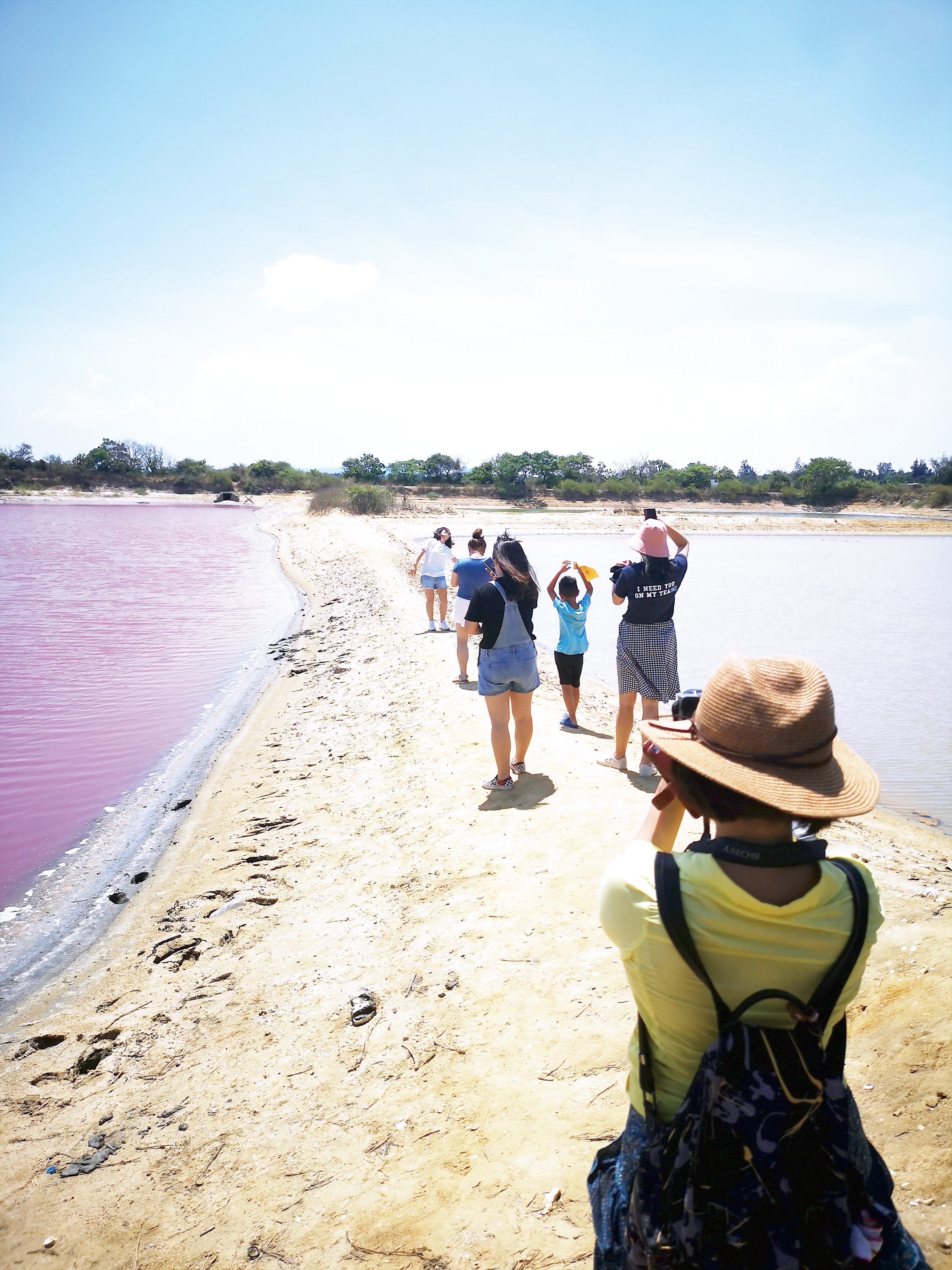 因為藻類增生的結果,位於慈湖東邊的魚塭有一池變成粉紅色了!消息迅速透過網路發酵,幾天下來吸引了許多的遊客前往。在近午的高溫下,池水的顏色越趨鮮豔,有人說像是傾倒了顏料,有人形容為像是血的顏色一般,尤其還聞得到微微的臭味。 這個近日成為拍照勝地的魚塭,就在慈湖的東岸,可由李光前廟前的小路前往。透過網路的傳播,漂亮的景致成為人們趨之若鶩的必拍景點,如果出動空拍機,更能清楚看見該池魚塭的池水顏色迥然異於旁者,而一旁其他的池水也有呈現青色、土黃色的特色,像是調色盤般多彩。 民眾為留下到此一遊的紀念,會站在兩池不同顏色的魚塭間堤岸拍照,在民眾紛紛前往朝聖下,魚塭旁的堤岸上,可見到幾個陷得較深的足印。通往粉紅魚塭的小路,約僅容許一台車輛前進,路的兩旁就是魚塭和挖得寬深的渠道。29日有外來的遊客駕駛車輛進入,不慎車輛傾覆,結果得出動吊車救援。正值類出國之旅大推的這個暑假,提醒賞美景的民眾們,也得注意安全喔。