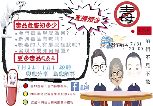 金門毒品現況如何?新興毒品有哪些?吸毒的人有那些症狀?發現親友吸毒如何處理?針對以上議題,鄉親都很關心,金門縣警察局將於今(31)日晚間8時在「KPB直播間」辦理「反毒宣導」臉書直播活動,向民眾說明本縣毒品現況,歡迎民眾踴躍準時上網收看。 毒品防制是當前政府重要治安議題,亦是施政重點之一環,縣長楊鎮浯更宣示毒品防制沒有妥協的空間,指示縣府各單位共同努力做好反毒工作,不容許對金門社會造成損害及安全問題。 縣警局局長張國雄也要求所屬針對毒品案全力查緝,溯源偵辦,務必除惡務盡。經過警察同仁的努力,金門治安環境相對穩定,近來警政滿意度高達到9成3,深獲民眾肯定。為了讓民眾了解警方在查緝毒品工作上努力及預防毒品危害發生,張國雄也特別指示金湖分局派員在警察局臉書直播。為增進與民眾互動,直播過程中並提供豐富精美禮品,歡迎民眾踴躍參與。 金湖分局分局長黃維章表示,毒品除了造成身體危害外,吸食毒品的金錢消耗會造成犯罪率上升,吸毒者常因無經濟來源轉為販毒者,吸食毒品後精神狀態不佳亦增加社會危險。有鑑於此,特別利用近年來熱門臉書社群媒體,向民眾宣導反毒、拒毒觀念,確保本縣良好治安環境。