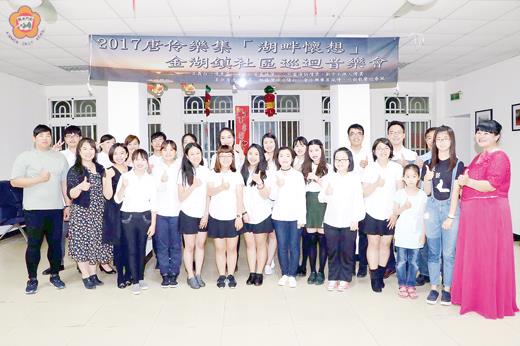 由文化部、金門縣政府指導,金門縣文化局主辦的2017唐伶樂集「湖畔懷想」金湖社區巡迴音樂會,前晚首在正義里辦公處展開。音樂會以合唱、獨唱形式呈現,唐伶樂集特邀請金門大學合唱團、銘傳大學金門分部合唱團、王立梅老師、許宇寰老師、陳月蓮老師共襄盛舉,藉以推動藝術下鄉巡演的活動,活絡社區的聽覺藝術文化。 這是歷年來,第一次有金門的演出團體投入自己偏鄉城鎮的演出形式,也帶出了金湖鎮其在地的特色,更是將正義、瓊林、山外、新市、溪湖、料羅,都呈現其特色美感。 這群來自福州、浙江、武漢、廣東、高雄、台中、桃園、台北、基隆,以及金門的學生和老師們,演唱了來自中外名曲,全場如癡如醉,並邀約正義國小五年級黃以恩同學、二年級陳筠頻同學,以及金湖國中八年級陳律涵同學共同攜手演出,高齡九十二歲的資深美女,更是從彩排到九點演出完畢,都陪伴著全部的演出人員,讓演出團隊倍感溫馨! 這場演出由陳月蓮老師演唱經典歌曲「茉莉花」開始,其詮釋方式有別於傳統的演唱,讓人耳目一新;許宇寰老師除演唱流氓阿德「無路用的咖小」外,更唱出自己創作的「龐克詠春拳」,將美好的歌聲與彈奏技巧展現;金門大學合唱團帶來膾炙人口的「A thousand years」、「proud of you」,銘傳大學合唱團帶來「大魚」、「你曾是少年」;唐伶樂集「You Raise me up」。此次最令人感動的是「冬絲娘」首演,由陳月蓮老師譜曲、演唱,將道地金門腔呈現,曲風柔美,符合金門女子的傳統精神,在現場八十歲以上的女性觀眾,都回到了年少祈求手藝精湛的那個時空! 接下來將於5月13日19:00於瓊林社區發展協會,5月14日15:00於山外社區活動中心,5月14日19:00在新市籃球場,5月21日15:00在溪湖社區活動中心,5月21日19:00將在料羅社區活動中心。歡迎鄉親蒞臨聆賞。