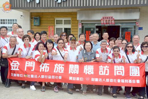 社團法人觀世音慈心會送愛到離島金門,會長王清祥帶領37位夥伴展開大金門四鄉鎮的慰訪工作,關懷41戶的急難戶、低收入戶,送出新台幣二十多萬元的慰問金。縣府秘書黃秀珍代表陳縣長感謝他們散播愛的義舉,分享他們樂當快樂的「活菩薩」。 觀世音慈心會會長王清祥、前任會長王文魁、何文杞帶領游榮茂等夥伴來金展開訪困濟助慰問佈施活動。縣府秘書黃秀珍特別轉達陳縣長推崇該會發揚「老吾老以及人之老,幼吾幼以及人之幼」的崇高胸懷,將人飢己飢人溺己溺的精神,散播到各地,提供急難救助,濟助貧困家庭。 在縣府秘書黃秀珍的協助,該會金門站站長王健力的引領下,王清祥一行昨日分組展開大金門四鄉鎮的慰訪工作,慰問41戶的急難戶、低收入戶,各贈送五千或六千元不等的慰問金,總計送出新台幣二十多萬元的慰問金,表達關懷之意。 黃秀珍很感動這一群夥伴無私的付出,經年深入台省各地以及離島佈施愛心,黃秀珍說,這是一群快樂的「活菩薩」。 王清祥會長指出,該會立案創會迄今,邁入第31年,成員從三十幾位熱心人士開始,至今全台已擁有壹萬多位會員及贊助會員;除台北總會外,全省各縣市都有聯絡站,會員已遍佈全國各地。王清祥表示,該會全年持續訪困濟助慰問佈施活動,讓需要愛心的人,得到愛心,需要幫助的人得到援手,把溫暖遍播各個角落。