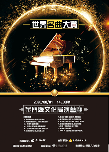 8月1日下午二時三十分於文化局演藝廳,由君涵樂坊為金門的聽眾帶來代表世界各地風格的樂曲-音樂饗宴『世界名曲大賞』音樂會。由優秀的演唱家林湘玲、吳芝茵老師,以及數位知名的樂器演奏者:二胡劉育秀、笛馬霈瑜、鋼琴王文妤等老師演出。歡迎鄉親到場聆賞,隨著樂音遨遊世界。 君涵樂坊於2002年由音樂家邱君慧創立,多年來積極與各地音樂性團體交流,有著豐碩的演出經驗。多次受邀到國家音樂廳參與活動演出,也曾參與捷克國際藝術節、克羅埃西亞國際藝術節。 本次音樂會將以束手之名樂曲:老鷹之歌(祕魯)、倫敦鐵橋(英國)、匈牙利舞曲(匈牙利)、Can You Feel The Love Tonight(美國)、望春風(台灣)、好地方(台灣客家)、天路(中國)、西班牙姑娘(西班牙)、濱邊之歌(日本)及改編自美國電影真善美的DO RE MI等作一精湛的展現。 音樂會中將集聚樂界當下優秀的演奏人才,以其專業的演出,共同展現中西方音樂的特色與情懷,並注入新的技巧予以重新詮釋,呈現出充沛的活力與生命的藝術新貌。歡迎鄉親到場聆賞。