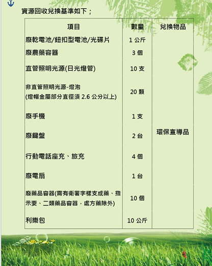 為了響應環境保護,並且鼓勵民眾將廢棄不用的物品進行資源回收再利用,金城鎮公所從明日(星期日)起,至十二月六日(星期日)為止,於金水里辦公處,一連舉辦六個場次的金幸福資收站「資源回收換好禮活動」,歡迎民眾將家中用不到的資源回收物收集之後,前往金水里辦公處來共襄盛舉,一起來隨手做環保,共同維護清潔家園。 這場由金城鎮公所舉辦的金幸福資收站「資源回收物資兌換好禮活動」,最主要的目的在為持續推動垃圾減量、以及資源回收等各項環保工作,因此金城鎮公所特選在今年的下半年度,預計辦理六個場次的資源回收站兌換好禮的活動,首場將在本周日登場,而每個場次的活動時間,都是從上午八時三十分起展開,至十一時結束,為時兩個半小時,而活動的地點都是在「金水里辦公處」舉行;各場次的日期分別為七月二十六日(星期日)、八月二日(星期日)、九月六日(星期日)、十月四日(星期日)、十一月一日(星期日)、十二月六日(星期日)等六天,以每個月一場的方式舉辦這項活動。 金城鎮公所表示,只要民眾收集符合「資源回收物資兌換好禮活動」規定的資源回收物品的種類以及數量之後,在活動舉辦的時間以內,將回收物品帶到金城鎮金水里辦公處,就可以兌換一份精美的環保宣導品。 這項金幸福資收站「資源回收物資兌換好禮活動」的兌換物品內容,其兌換的基準說明:「廢農藥容器」的兌換數量為:三個。「廢乾電池(含鈕釦型含汞電池)」的兌換重量為:一公斤。「廢光碟片」的兌換重量為:一公斤(約六十片左右)。「日光燈管」的兌換數量為:十支。「燈泡(燈帽金屬部份直徑須二點六公分以上)」的兌換數量為:二十顆。「廢棄手機」的兌換數量為:一支。「廢棄鍵盤」的兌換數量為:兩台。「行動電話座充」的兌換數量為:四個。「旅充」的兌換數量為:四個。「廢棄電風扇」的兌換數量為:一台。「廢藥品容器(需有衛署字樣之成藥、指示藥、二類藥品容器,但處方藥除外)」的兌換數量為:十個。「利樂包裝」的兌換重量為:十公斤。民眾只要收集到前述中符合任一樣物品的足夠數量者,就可以獲得兌換一份環保宣導品。 金城鎮公所表示,歡迎民眾在活動的當日,將家中使用完畢之各項資源物資帶至活動的現場,即可以依照資源回收物之數量以及項目進行兌換環保宣導品。另外,民眾若是對金幸福資收站「資源回收物資兌換好禮活動」的內容以及舉辦時間、地點有任何疑問的話,也可以致電金城鎮公所進行洽詢,電話為:(082)325057、325058轉環保課。