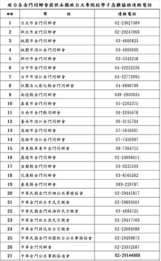 去年屏東縣金門同鄉會主動建議,願成為本縣旅台學子遇緊急救難時的求援對象,提供急難之協助,金門縣政府有感金門旅台就學子弟遍及全台,特別擴大屏東縣金門同鄉會的美意,並與27個旅台金門同鄉會取得聯繫,均熱心答應願意提供旅台求學的家鄉子弟急難狀況上的協助,讓旅台學子就學安心、家長放心。 為關懷金門旅台學子,去年屏東縣金門同鄉會主動建議,願成為本縣旅台學子遇緊急救難時的求援對象,提供急難之協助,獲得鄉親們正面迴響。 金門縣政府有感金門旅台就學子弟遍及全台,期藉由屏東縣金門同鄉會的美意,讓此立基點更為擴大,全面性顧及本縣旅台學生,遇緊急狀況時能獲得即時到位之協助,縣府教育處與27個旅台金門同鄉會取得聯繫,期透過各縣市同鄉會的協助,解決旅台學子緊急救助的需求,結果27個旅台金門同鄉會均熱心應允願提供旅台求學的家鄉子弟急難狀況上的協助,讓旅台學子就學安心、家長放心。 針對今年即將展鵬高飛的應屆畢業生,教育處業已行文金門高中及金門農工,以提供旅台就讀學子急難協助之金門同鄉會名冊,俾利提供學生完善之協助管道,盼有需求之學子善加利用。 有關旅台各金門同鄉會聯絡資訊及金門縣政府駐台服務中心聯絡資訊公告於金門教育fun學趣。