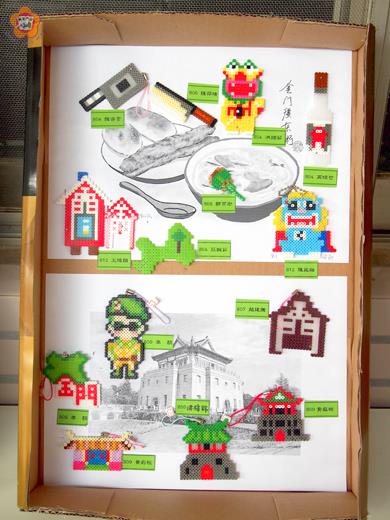 金城國中八年級學生,在董麗嬋、陳韶婕指導下,用拼豆手工藝品,以金門為主題進行創作,內容深具巧思及在地特色,並於學務處前展出兩週,也獲得全校師生讚賞。 金城國中表示,董麗嬋和陳韶婕兩位老師利用綜合活動課,指導八年級學生拼豆手工藝創作,並將金門為主題。學子將金門在地景點、特產、美食、藝品、文化等融入教學,學生發揮創意用拼豆材料,設計出許多具金門特色的作品。 金城國中八年級學生所創作的拼豆作品,小巧玲瓏、五顏六色,足見學生巧思,也吸引師生目光。金城國中將學子作品陳展於城中學務處前為期二週,也博得全校師生的讚賞。 金城國中也說明,透過創作,學生盡情揮灑,也展現家政、藝文和社會各領域等綜合活動教學的創意結晶和成果。