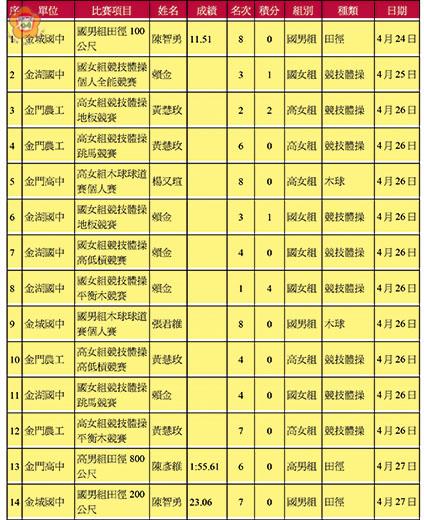 經過一連多日的田徑場上激烈拚戰,106年全國中等學校運動會於昨(27)日劃下圓滿句點,金門縣代表隊共獲得1金、1銀、2銅、3個第四名、2個第六名、2個第七名、3個第八名。 106年全中運於4月22日至27日在彰化縣盛大展開,比賽項目計有田徑、游泳、韻律體操、競技體操、射箭、桌球、羽球、網球、軟式網球、柔道、跆拳道、空手道、舉重、射擊、拳擊、角力、武術、木球等十八項競賽項目,有來自全國各縣市的青年運動好手同場較勁,爭奪各項獎牌。 金門縣代表隊由金門高中、金門農工、金城國中、金湖國中、金寧中小學、烈嶼國中共同組隊,參加田徑、體操、木球、跆拳道4項賽事;其中田徑項目19位選手、競技體操項目2位選手、跆拳道項目7位選手、木球項目5位選手,共計33位選手,含教練及隊職員本次金門縣代表隊共計51位。 經過激烈的競賽,金門縣代表隊共獲得1金、1銀、2銅、3個第四名、2個第六名、2個第七名、3個第八名,其中以金湖國中參加競技體操項目之賴金同學榮獲1金、2銅、2個第四名表現最佳;另代表金門農工參加競技體操項目之黃慧玫同學於本賽事進行中不慎受傷情況下,仍勇奪1銀、1個第四名、1個第六名、1個第七名,其努力不懈,永不放棄的精神,正是代表金門運動家之精神。 今年的全中運閉幕典禮於彰化縣演藝廳舉行,由秀水國中直笛隊帶來「愛爾蘭組曲」、彰化藝術高中舞蹈班畢業生自編「舞youth青春」在閉幕典禮中表演;之後緊接著登場的是本次精彩賽事的回顧,呈現賽會點點滴滴與田徑選手在競技場上激戰及喝采和得獎喜悅的身影,畫面十分的動人,下屆的全中運主辦單位為臺中市政府。 另,在今年全中運競爭超級激烈之田徑項目,金門高中陳彥維榮獲高男組田徑800公尺第六名、金城國中陳智勇勇奪國男組田徑200公尺第七名、國男組田徑100公尺第八名,實屬非常不易!