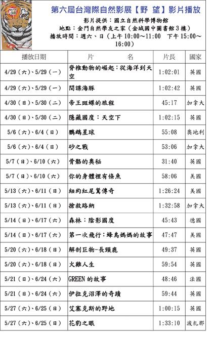 由「國立自然科學博物館」提供的「第六屆台灣國際自然影展【野望】」20部精彩影片,自即日起至六月底止,將在金門自然學友之家(金城國中圖書館3樓)播放,每週六、日暨端午連續假日各播放2部(上午10:00;下午15:00),歡迎大家前往觀賞。 縣府教育處指出,源自「綠色奧斯卡」的台灣野望國際自然影展,自2011年起,「台灣野望自然傳播學社」即與英國Wildscreen影展合作,將世界級的生態、環境紀錄片引進台灣,以公益性質播映至今。台灣野望國際自然影展今年度首由Wildscreen影展得獎入圍作品中,挑選出20部影片投入全國各地巡播。 為增加地區青年學子接觸世界生態紀錄片的機會,拓展環境保育的視野,縣府教育處「科學日系列」特向「國立自然科學博物館」借來難得一見的國際自然影展影片來金作為期二個月的巡演。 第六屆台灣國際自然影展【野望】20部影片,包含有:美國《第一次飛行:蜂鳥媽媽的故事》--提名2012兒童評審獎、德國《森林:陰影國度》--2010電影藝術獎得主、英國《隱藏國度:天空下》--2014最佳音效獎得主、英國《黑猩猩奧斯卡》--2014最佳劇院獎得主、美國《你的身體裡有條魚》--2014評審團推薦獎、英國《脊椎動物的崛起:從海洋到天空》--提名2014最佳系列獎、英國《間諜海豚》--提名2014動物行為獎、奧地利《億萬鱘魚》--提名2014環境及保育獎、奧地利《帝王斑蝶的旅程》--提名2014最佳劇院獎、英國《骨骼的奧秘》--2014最佳主持人獎、加拿大《砂之戰》--提名2014環境與保育獎、奧地利《鸚鵡星球》--提名2014最佳剪輯獎、加拿大《搶救路納》--2008人與動物獎得主、美國《紐約紅尾鵟傳奇》--2010最佳劇本獎得主、英國《火雞人生》--2012金貓熊獎/2012人與自然獎/提名2012最佳劇本獎及最佳剪輯獎、波扎那《花豹之眼》--2008動物行為獎得主、英國《愛塞克斯的野地》--2010最佳剪輯獎得主、英國《伊拉克沼澤奇蹟》--提名2012人與自然獎、法國《GREEN 的故事》--2010金貓熊獎得主/2010環境獎得主、英國《解剖巨物:長頸鹿》--提名2010最佳系列獎。