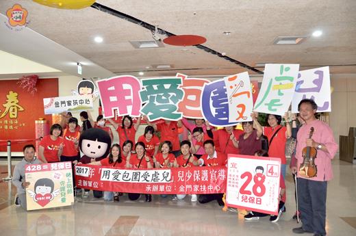 昨為428兒童保護日,金門家扶在李桂平主任登高一呼下,分別在金門航空站及水頭商港旅服中心接連辦了二場「用愛包圍受虐兒暨LOVE HUGS」快閃運動,呼籲穿梭來去的過境旅客和民眾鄉親一同加入兒童保護的行列。 李桂平指出,家扶基金會推動兒童保護服務至今已滿30年,共救助了22,353名受虐兒童,除了早期推動兒保專線與兒童保護好鄰居外,近年更提倡4月28日為兒童保護日,推動「用愛包圍受虐兒」的理念;為了鼓勵父母多擁抱孩子,以最直接的關懷行動提供給孩子安全感與愛的力量,家扶更推出了「LOVE HUGS護童擁抱」運動,於4月20日至4月27日期間除在社群網站上號召民眾網路串聯,貼出擁抱照、展現愛的力量外,知名網路紅人如白癡公主、聖結石、于卉喬、蔡瑞雪等人也都一同響應活動,貼出趣味擁抱照。 昨日下午2時起,李桂平偕社工與義工皆穿著代表守護孩子的紅T恤穿梭於航空站與水頭商港,向民眾募集溫暖的擁抱。特別是選定金門人潮最為密集的航空站及水頭商港旅服中心作為快閃活動地點,邀請地區知名的音樂家許銘豐老師協助樂器演奏,以音樂、歌唱、舞蹈的方式掀開活動序幕。 連二場平常在金門並不多見的快閃運動,雖然規模不大,也難以和那些世界級的快閃運動比擬,但家扶義工朋友在現場賣力的演出,仍吸引了不少過境旅客的目光,李桂平除了帶領民眾歡跳兒保操,也以「用愛包圍受虐兒」標語及九條好漢在一班曲調的兒保口號,讓民眾知悉家扶推動兒童保護的決心