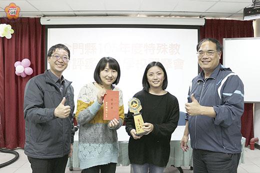 金門縣政府教育處於日前辦理「金門縣105年度特殊教育評鑑績優學校觀摩會」,邀請縣內各設有特教班級之國中小(含幼兒園)參與觀摩會並頒發評鑑優等獎獎座、獎勵金及特別獎獎勵金,獲獎績優學校於會中發表特殊教育經營理念及業務執行經驗。教育處處長李文良表示,期望透過觀摩會形式,供各級學校交流及經驗分享,以提升特教服務品質。 教育處指出,依據特殊教育法,各縣市對於所轄特殊教育班級學校,每三年應辦理評鑑,以了解各班級運作概況,並獎勵優秀班級;105年度本縣依法委託國立臺灣師範大學特教中心辦理評鑑工作,由專家學者、資深教師、行政人員等代表組成評鑑小組於105年10月至各受評學校進行實地評鑑,並利用書面資料、訪談及實際教學觀摩等多元的方式了解各校特殊教育之運作優勢,以及需改進事項,期望由評鑑中了解學校特殊教育運作之困境,並協助提出改進建議。 本次評鑑項目包含行政資源、課程教學、學生輔導、轉銜服務及績效表現等五大項;評鑑成績分為優等、甲等、乙等(需追蹤輔導)及特別獎,結果由本縣金湖鎮多年國小榮獲優等之殊榮;特別獎部分則由分項目具有特色表現之學校獲獎,中正國小及卓環國小獲得課程教學特別獎、金沙國中獲得轉銜服務特別獎、金湖國中及金沙國小獲得行政資源特別獎、金城幼兒園獲得績效表現特別獎。 教育處表示,多年國小在各分項目上皆獲得肯定,其中陳來添校長帶領行政團隊營造優良的學習環境,教師間則能展現積極的合作態度,提供特教學生適性的教學是學校的一大特色。 多年國小特教教師陳雨靈老師亦擔任本縣特殊教育輔導團兼任輔導員,她與另一位特教教師蔡秀慧老師在課程教學上皆展現高度的熱忱,能將每位學生的個別化需求予以滿足,並將專業團隊給予之建議融入教學中,而教具的製作,更是讓每個學生樂在學習,將枯燥的教學內容變得生動活潑。