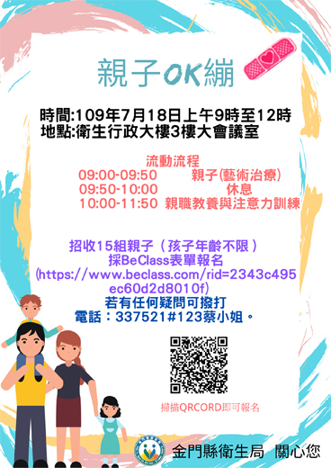 衛生局訂於7月18日上午九時至十二時假衛生行政大樓三樓大會議室辦理「親子OK繃」衛教活動(如圖),本次邀請金門醫院鄧宇捷心理師及黃心潔職能治療師,課程內容生動豐富,歡迎踴躍報名。報名時間從即日起至報名額滿為止,限額十五組親子(孩子年齡不限),歡迎接受早療服務或有興趣之親子一起報名,本活動採BeClass平台報名,若有任何疑問可撥打電話:337521#123蔡小姐。 衛生局表示,透過專業人員分享,教導家長如何養育注意力不足過動症孩子及訓練孩子的注意力,並藉由藝術治療,促進親子間的溝通互動,以減輕家長照顧壓力,並提升家庭成員間的融合。另衛生局提醒,因應疫情防治,在室內應保持1.5公尺社交距離,請參加者當天自行攜帶口罩於活動期間全程配戴,並且配合工作人員量測體溫。