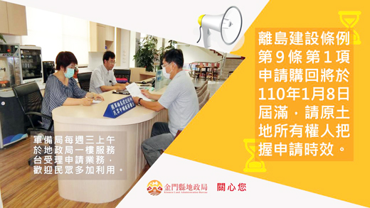 離島建設條例第9條第1項申購期限將於110年1月8日屆滿,金門縣政府提醒符合申請資格之原土地所有權人或其繼承人,把握時效儘速向各土地管理機關洽辦。 縣府指出,依離島建設條例第9條第1項規定:「本條例適用之地區,於實施戰地政務終止前,或實施戰地政務期間被占用於終止後,因徵收、價購或徵購後登記為公有之土地,土地管理機關已無使用或事實已廢棄使用者,最遲應於本條例中華民國一百零二年十二月二十日修正施行之日起二年內全數公告;原土地所有人或其繼承人並得於公告之日起五年內,向該管土地管理機關申請按收件日當年度公告地價計算之地價購回其土地。但徵收、價購或徵購之價額超出該計算所得之地價時應照原徵收、價購或徵購之價額購回」。 縣府也說明,該條例於民國103年1月8日公布施行,公告期限自103年1月10日起至105年1月9日止,經查土地管理機關於起始日起陸續辦理公告,並已轉載金門縣地政局網站方便民眾查詢,期間雖有部份土地已完成公告5年期滿,但還是有部份土地公告申請購回期限於110年1月8日期滿,為保障當事人權益,縣府再次籲請原土地所有人或其繼承人把握時效於公告屆滿前儘速向各土地管理機關洽辦購回事宜;如果鄉親還是有不瞭解之處,歡迎電洽082-326663轉63123、63125金門縣地政局。