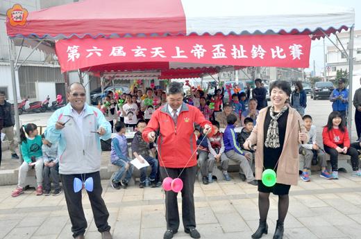 金寧鄉盤山村廣濟廟管理委員會慶賀玄天上帝聖誕千秋舉行慶典活動,並結合盤山扯鈴民俗運動推展協會共同辦理第六屆「玄天上帝」盃扯鈴比賽,精湛的演技也獲得滿堂彩,民眾看了都嘖嘖稱奇,優勝隊伍也獲得頒獎表揚。 廣濟廟管理委員會配合廟慶辦理「玄天上帝」盃扯鈴比賽,今年邁入第六屆,提供學生表演的舞台機會,也增加廟慶的慶典氣氛。金寧鄉長陳成勇、鄉代會主席陳成泉除到廣濟廟上香敬祭,也和金鼎國小校長蔡雪芳一起為扯鈴比賽舉行開鈴儀式。隨後分公開組、初級組進行競技比出高下。 第六屆「玄天上帝盃」扯鈴比賽成績,初級組:第一名,陳品言。第二名黃思為、黃奕捷,第三名翁佳如、翁子彧,第四名許芷綺、莊心語,第五名翁子晴、李園梓。公開組:第一名翁敏恩、陳品妤,第二名翁靖雯、翁翊純,第三名翁雨軒、翁毓,第四名蔡睿珊、邱慧雯,第五名翁瑋彤、翁苡晴。 獲獎同學也表示,比賽前的準備是十分累人的,除了基本技巧要足夠之外,動作要自己編排,還要充分的練習,每週練習多次,覺得時間好像有點不夠用。到了上場前心都還是怦怦跳!臨上場前,他告訴自己,只要穩穩的把平常的練習狀況拿出來就可以了,他很專心的聽著自己的音樂,看著手中的鈴與棍,幾個有難度的動作都順利完成,獲得場邊夥伴們的掌聲!這次比賽的經驗讓他非常難忘,他喜歡扯鈴,他喜歡和同伴們一起練習、互相激勵的感覺,比賽雖然已經落幕,但他仍然會繼續朝著更高的技術精進!