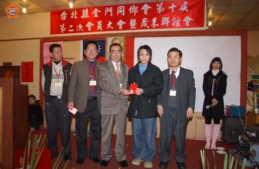 台北縣金門同鄉會召開會員大會,會中除頒發同鄉會子弟獎學金,理事長黃獻平同時致贈感謝狀給熱心會務,每年捐贊同鄉會獎學金、提攜後進的名譽理事長張邦育先生,及致力促進同鄉會與中和市公所建立良好互動關係的李宗漢先生,讚許他們對於同鄉會會務推動的協助與熱心。 台北縣金門同鄉會日前召開會員大會,會中並頒發了十五位同鄉子弟獎學金,分別是就讀研究所的邱誠樸(交通大學)、洪政欣(海洋大學)二人,各獲得獎學金六千元;就讀大學的吳佳蓁(銘傳大學)、蔡緯毅(中興大學)、李卓翰(淡江大學)、李品儀(輔仁大學)、蔡維真(實踐大學)、姚宗甫(台灣大學)、黃秋鈴(淡江大學)、楊筑鈞(銘傳大學)等八人,各得獎學金五千元;就讀技術學院的陳政宇(德霖技術學院)、吳佩蓮(金門技術學院)、陳毓琳(金門技術學院)、李舒琦(聖約翰技術學院)、李佩蓉(長庚技術學院)等五人,各得獎學金四千元。 會中,台北縣金門同鄉會理事長黃獻平也特別頒發了二份感謝狀,一幀是感謝名譽理事長張邦育先生,感謝他多年來熱心參與會務,並每年均捐助同鄉會獎學金數十萬元,提攜後進,不遺餘力。一幀則是頒給現任職中和市財政課長的李宗漢先生,感謝他協助同鄉會與中和市公所建立良好的互動關係。