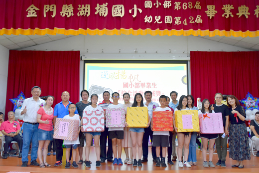 金寧鄉湖埔國小昨日舉行國小部第68屆,幼兒園第42屆畢業典禮,17位國小部畢業生以及21位幼兒園畢業生在校長、老師、家長的祝福下,畢業展開另一階段的學習旅程。校長蔡玉羨並以「熱情的心、堅毅的心與歸零」來與同學共勉,期許同學邁入新的階段能有新的未來,學習面對各種挑戰、難關,邁向成功大道。 湖埔國小畢業典禮由校長蔡玉羨主持,縣長楊鎮浯、議員楊永立,金寧鄉長楊忠俊、縣府教育處許能麗科長等以及湖埔村長楊振嵩和家長會委員、學生家長等貴賓到場,一同祝福畢業生鵬程萬里。湖埔國小在校生因新型冠狀病毒疫情因素,沒有到畢業典禮會場參加,改由在班上觀看典禮直播,一起分享喜悅。 楊鎮浯說,每次參加畢業典禮看到學童,就深感自身責任重大,因有責任要幫大家打造一個永續環境,讓大家有一舒適優質生活環境。並表示在教育這區塊也特別重視,並以「保持好奇與學習的心、學會尊重他人,同時永保好奇與學習的心,才能讓自己一直的成長」與同學共勉,縣府該做也會盡力來做,包含湖埔國小教學大樓,預定明年完工,希望能提供一處更優質學習環境,不管是校園的建設、相關事務上的調整,希望給大家越來越好的環境。