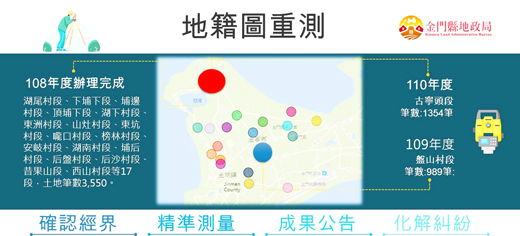金門縣地政局於109年度辦理金寧鄉盤山村段的地籍圖重測,並自109年7月1日至109年7月31日止公告重測結果,重測結果圖冊陳列於地政局會議室,測區範圍內土地所有權人若有不明瞭之處,請攜帶重測結果通知書、國民身分證、私章等,逕向該局閱覽重測結果,該局派有專人為您說明服務。 地政局指出,土地所有權人如認為重測結果有錯誤,應於公告期間內,依照地籍測量實施規則,填具異議複丈申請書(金門縣地政局免費提供)向金門縣地政局繳費申請複丈,逾期不受理。重測期間未依地政機關通知之期限內,設立界標或到場指界者,依土地法第46條之3規定,不得申請異議複丈。重測結果,經公告期滿土地所有權人無異議者,即屬確定。地政機關依法據以辦理土地標示變更登記,並將登記結果,以書面通知有關土地所有權人辦理換發權利書狀。 地政局表示,為改善早期圖解地籍圖測量精度,提升測量成果品質,地政局近年來積極推動地籍圖重測計畫,108年度計辦理完成金寧鄉湖尾村段、下埔下段、埔邊村段、頂埔下段、湖下村段、東洲村段、山灶村段、東坑村段、嚨口村段、榜林村段、安岐村段、湖南村段、埔后村段、后盤村段、后沙村段、昔果山段、西山村段等17段,土地筆數3,550筆地籍圖重測作業,另經陳報內政部核定109-110年度自辦地籍圖重測計畫,續於109年度辦理金寧鄉盤山村段989筆、110年度辦理金寧鄉古寧頭段1359筆地籍圖重測,目前全縣已完成數值法測量筆數占全部已登記土地筆數達93%,除釐正地籍,確認經界,並加速土地複丈速度,維持測量成果一致性。 重測作業展辦前,地政局先於測區村里辦公處召開重測宣導說明會,向土地所有權人說明重測目的、程序及相關應注意事項,再透過通知土地所有權人到場實地指界,確認經界,完成地籍調查作業後,以現代測量技術及儀器辦理界址測量,重新計算面積、繪製地籍圖,使每一界址點均有坐標值,可由電腦展繪不同比例尺之地籍圖提供使用,避免圖解地籍圖之圖紙伸縮、謄繪與讀數等誤差,不僅擴大地籍圖功能,並可利用資訊處理,大幅提昇行政效率與服務品質。 另針對重測期間因雙方土地所有權人指界不一致而產生之界址爭議,地政局依規定移請本縣不動糾紛調處委員會辦理調處,透過公私部門具有地政相關專業知識之專家學者,提供最佳解決方案,圓滿解決土地糾紛,減少訴訟案件。 實施重測地段土地所有權人如有任何重測問題,歡迎洽詢地政局測量科,電話(082)321177轉分機63235,地政局同仁將竭誠為您服務。