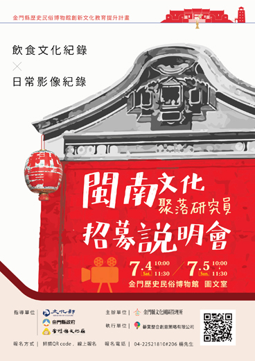 金門文化園區接續「點燈人」招募閩南文化聚落研究員,記錄聚落常民眼中的「島嶼史事」。 金門縣文化園區為讓閩南文化走入民間,深化聚落連結,招募閩南文化聚落研究員,成為聚落點燈人,紀錄今日聚落文化成為明日的歷史記憶,致力常民文化記憶庫,推動「活的閩南博物館島」進程。 這次文化聚落研究員培訓課程。一為閩南飲食文化紀錄課程,邀請金門文藝張姿慧總編輯、島嶼食事作家洪玉芬總經理及本地知名總舖師阿德師擔任講師,陪伴學員,以學員對金門的飲食文化記憶及五感體驗,用藝術方式呈現;二為閩南日常影像紀錄課程,邀請台灣電影文化資產保存協會理事長井迎瑞教授及國立台南藝術大學音像紀錄與影像維護研究所曾吉賢教授,陪伴學員,用聚落居民角度培訓學員紀錄常民閩南文化及生活影像,用自己記錄自己的影片發表呈現。 為使大家更清楚本次招募方式及課程內容,於109年7月4日及7月5日上午9點45分假文化園區圖文室舉辦招募說明會,請大家踴躍報名參加。報名方式可掃描海報下方QR;或金門文化園區「博物館櫃台報名專線082-351032(週一休館)歡迎大家來參加,共同成為金門閩南文化傳承盡一份心。 報名請掃描海報右下方QR Code或相關諮詢服務專線撥打(04)2252-1810#206。