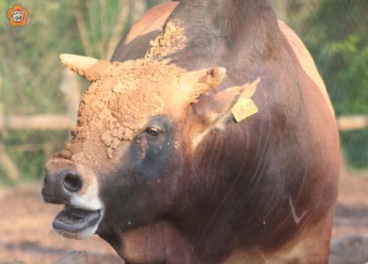 黃牛敷紅泥,美膚? 一頭黃牛,把紅土和水和成的泥漿,塗在牛額、牛面,像是敷上了面膜。難道,牛也需要美膚?那牠究竟是要美白、美黃,還是美紅? 牠面朝泥土,頸搓樹幹;看情形,牠先以泥土當面膜,後以樹幹當如意,目的是為了止癢。 據畜試所所長陳世保表示,黃牛用泥土敷面,可能有隔絕蚊蟲或止癢的效果。