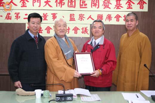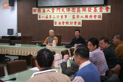 財團法人金門大佛園區開發基金會第一屆第二次董事、監察人聯席會議昨召開,董事長明乘長老希望金門各界一起來推動金門大佛園區開發,為金門做一點奉獻和建設,讓金門成為朝聖、觀光勝地,為金門子子孫孫建立一個吃不盡、用不完的搖錢樹,使金門真正發展起來。 昨聯席會議中,並就去年十月舉辦八永日的兩岸和平消災祈福水陸大法會進行檢討。 財團法人金門大佛園區開發基金會第一屆第二次董事、監察人聯席會議,昨日上午十時起至中午一時二十分,在金門縣政府第三會議室舉行,由董事長明乘長老主持,董事李炷烽、李台山、張火良(釋性海)、王振利、林成炎、張邦育、李榮文、吳素蘭、周浯斌、張雲盛、陳昆第、心育師父,以及監察人黃景舜、盧志權、楊清國等出席參加。 明乘長老致詞表示,承蒙大家看得起,榮幸擔任金門大佛園區開發基金會董事長,由於大佛園區推動,建設和奉獻都不是很小的事,也不是隨便做一做,能結合董事、監察人力量、精神、智慧、奉獻,以真正為金門做點建設和奉獻。 明乘長老指出,他與金門結下很深緣份,在於民國三十八年十月到金門,當時的古寧頭大捷發生,他就駐紮在料羅彎陳坑,雖未參加戰役,但看到金門危險性,在一戰勝利之後,一直到現在,金門雖然平安,但不能光求勝利和平安,不求繁榮進步。二十年前,廈門是鄉下,金門是都市,但二十年後,反過來了,金門是鄉下,廈門是都市,金門的確比對岸落後很多,是希望大家多為金門發心、付出一點力量,以讓金門帶來永恆的建設和好處。明乘長老也談起自己是半個金門人,緣於吃過兩位老太太煮的地瓜麵線,基於這份特殊又難能可貴的淵源,讓他念念不忘金門。因此,有機會為金門奉獻是責任和自己的想法。最近並毫不保留運了價值人民幣三、四百萬元的一百多棵大樹到金門。而在金門現住人口五、六萬人,移民海外討生活東南亞有七十多萬人,這樣不成比例,金門留不住人,要使金門發展起來,大佛園區推動建設的達成,將助益金門觀光和朝聖,為金門子子孫孫建立一個吃不盡、用不完的搖錢樹,讓金門真正發展起來。 明乘長老也指出,自己今年已七十五歲,在有生之年希望把金門大佛園區建成。而金門大佛園區依他個人想法,少說也要新台幣三十億元才能完成,由於經費龐大,要靠十方和大家同心協力來促成。並希望國外金門同鄉也能支持大佛園區的推動。至於大佛園區將朝永遠不落伍的建築,做世界級、最好的、壯觀的、藝術的歷史性建築努力。並建議中央應開放陸勞和砂石、鋼筋等材料,以節省更多經費。 也是董事的縣長李炷烽,則贊成為推動大佛園區,應先買一個固定的辦公場所,並提出園區構想圖(說帖),在時間不等我們,才能加速推動,以免一直停留在籌備的階段。 明乘長老對於在金城先找一個固定的辦公場所,並拋磚引玉率先捐出新台幣五十萬元,董事張邦育也不落人後,隨即也捐出新台幣五十萬元響應。縣長李炷烽則表示,要和太太商量,兩人各捐一個月的薪水來共襄盛舉。 昨會中,也通過推舉楊清國出任總幹事,並在各鄉鎮要找一個副總幹事的決議。明乘長老也期推動大佛園區團隊愈大愈好,以有更多人發心、奉獻,來把事情做好。 會中,也就建請聘請沙美地區仕伸成立大佛籌建後援會,協助敦促大佛籌建業務之推展;為落實基金會之管理運作機制,建請設置專屬辦公處所:::等七項提案,進行廣泛討論。 金門大佛經決議將設置在金龜山,去年農曆元月十六日籌備會並已組團赴大陸參訪,順道前往明乘長老河南的道場參訪。金門大佛籌建委員會並期將大佛園區案委託規劃,希望做成說帖的方式,爭取議員的同意,並開始發動募款。 至於財團法人金門大佛園區開發基金會設立的宗旨,係本於發揮宗教仁愛之精神,以興辦社會教化、公益慈善事業及促進地區宗教事業之發展為宗旨。辦理之目的事業,在興辦各項社會教化及公益慈善事業;籌建金門大佛及宗教園區,提供民眾宗教信仰空間,並促進地區宗教事業之發展及厚植觀光資源。