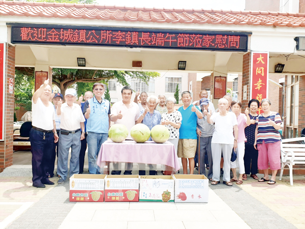 端午節前夕,金城鎮長李誠智前往大同之家,慰問並探視院內長輩,同時贈送西瓜,希望能在炎熱夏天中,來為長輩們消消暑氣。 金城鎮長李誠智率領金城鎮公所所有的課室主管前往慰問。李誠智首先向長輩們恭賀端午佳節愉快,他表示,由於端午節之前,不少單位或是社區都有準備粽子送到大同之家,雖然粽子美味,但對於長輩而言並不適合多吃,因此公所方面改以贈送水果。由於時序已經是夏季了,每天都是酷暑的氣候,所以準備「大西瓜」來為長輩們加菜外,也消暑一番。 對於金城鎮長一行人的到訪,受到長輩們以及大同之家主任楊志斌等人的熱情歡迎,楊志斌感謝金城鎮長致贈的消暑聖品,並隨即要求所內廚房切盤,作為長輩們中午的餐後水果。