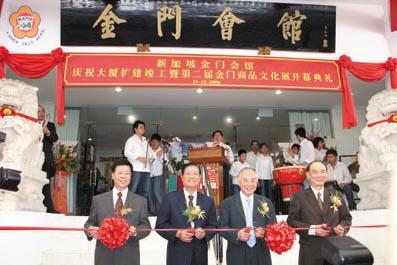 新加坡金門會館慶祝大廈擴建竣工暨第二屆金門商品文化展昨日盛大舉行,由福建省主席顏忠誠、縣長李炷烽、駐新加坡代表胡為真與新加坡金門會館主席黃祖耀共同主持剪綵,商品展獲得海外金門鄉親的熱烈迴響,整個展場擠得水洩不通,人氣強強滾。 新加坡金門會館慶祝大廈擴建竣工暨第二屆金門商品文化展昨日假新加坡金門會館前廣場盛大舉行,共有來自東南亞、台灣、廈門、菲律賓等十八個同鄉會館代表到場參加,而金門各界星馬訪問團的成員包括顏忠誠、李炷烽、副縣長楊忠全、議員莊良時、洪允典、陳玉珍、李沃士、楊應雄以及縣府各局室主管、各鄉鎮長等人也都出席這項典禮,將近四、五百位的參加者擠滿會館前廣場。 黃祖耀在致詞時表示,他於一九三七年離開金門,期間都一直沒機會回去訪問,一年多前回去時,看到金門的建設日增、發展繁榮,儼然已經成為旅遊勝地,而這都是李縣長與縣府團隊的功勞,希望今後可以有更多鄉親回家鄉走走,加強商業聯繫,促進交流與合作。 此外,他也感謝代表團此次帶來許多書畫、出版品,提供給僑親家鄉訊息,聊慰他們的思鄉之情。 李炷烽也表示,今天是我們新加坡金門會館擴建竣工的日子,這一天對我們新加坡的金門鄉親是一個重要的日子,對金門故鄉來說同樣也是一個具有非凡意義的日子。因為在這一幢會館中,有太多屬於新加坡與金門兩地鄉親共同奮鬥打拚的記憶。 李炷烽也細述新加坡金門會館的發展歷程與重要貢獻,他期許自己與縣府團隊能夠效法前輩,致力建設家鄉,讓華僑的娘家能有崢嶸出頭的樣子,持續加強家鄉與僑社的聯繫。 此外,李炷烽也提到,將在第二屆世界金門日會上發表金門作為「一國兩制試驗區」之芻議,他說,這是應金門縣議會的要求所提出,當時曾經引起媒體高度關注,希望將此議題成形,他說,金門在民國四十五年至八十一年間,有長達二十六年是實施戰地政務,當時的情況與台灣相較,也是一國兩制,而在二零零一年開啟小三通,則是另一個階段的一國兩制,金門的未來何去何從,這是國內外百萬金門鄉親共同關心的議題。 李炷烽也指出,如果金門發展成為「一國兩制試驗區」,可以是新台灣的出路,也可以為金門尋求其他可能出路,他非常樂意傾聽鄉親們對這項歷史性構想的心聲,縣府也將繼續努力,希望讓此議題獲得響應,提供金門未來的發展新契機,他說,金門雖小,但卻可以扮演更積極的角色。此番致詞一結束,現場的金門鄉親立刻給予最熱烈的掌聲,且久久不絕於耳。 胡為真則表示,金門是地靈人傑的地方,孕育相當多的人才,他在抵星工作的一年半期間,遇到各行各業許多傑出人士,他們都是金門人;他說,先總統蔣公曾說,金門與中華民國是密不可分,也是保衛台海的前哨基地,可以說,沒有金門就沒有台灣;他也推崇李縣長的老人年金等政策,將金門建設成為一個福利縣,這都是李縣長與縣府團隊的成就。 稍後並由由福建省主席顏忠誠、縣長李炷烽、駐新加坡代表胡為真與新加坡金門會館主席黃祖耀共同主持剪綵,儀式完成時,現場隨即響起熱烈掌聲。 在李炷烽的引導下,胡為真與黃祖耀及各會館的代表並逐一參觀金門商品文化展的各攤位,大家都對金門特產讚不絕口。在參觀金酒公司的攤位時,嘉賓與鄉親一起試飲金門高粱酒,同聲大呼讚! 第二屆金門商品文化展此次共有二十二個攤位,展出包括:高粱酒、金門菜刀、貢糖、一條根等商品,由於數量有限,昨日在會場,也引起僑親們的熱情搶購與詢問,大家一嚐家鄉特產,以解鄉愁。 此外,金門縣旅行同業公會此次也在會場,推介第二代金門子弟返鄉尋根之旅與包機直航新加坡、金門、廈門泉州六日遊兩種行程,希望號召更多鄉親回家鄉走走。 而金門縣文化局、與金門縣宗族文化研究協會也在會場進行展示,還有地政局所提供的協助鄉親解決土地爭議事宜等,都有不少僑親前往詢問。