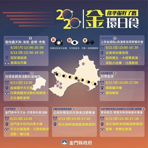 二十一世紀最後一次日環食的天文奇景,有著「天空金戒指」之稱譽,即將於明(廿一)日以最華麗又浪漫的姿態亮相,與天文迷見面!由於金門得天獨厚位在狹窄的環食帶上,全島都是最佳觀測點,可一探「上帝掉落金戒指」的天文盛事,縣府機關學校及社團規劃舉辦各項觀賞日環食豐富活動,並由教育處辦理的「日環食跨域研習」科普計畫、金門縣民宿旅遊發展協會策畫辦理「戰地轟天狗×UNPLOG×海堤音樂市集」活動將於今(二十)日先後率先登場,為明天的日環食系列活動揭開序幕,炒熱日環食活動的熱潮氣氛。 夏至│日環食!全國最早、最美的「日環食」則會出現在金門,也是最早可以看到日環食發生的地點(初虧下午二時四十四分),更是天文迷此生必看的奇景之一,錯過就要再等上一百九十五年。為在疫後活絡觀光產業景氣及為疫情減緩觀光人潮回溫做暖身,縣府觀光處已規劃舉辦吸引觀光客相關活動,而且本周觀光客已經成長將近五成,也票選出視野良好、最適合觀賞日環食又浪漫的十大觀賞景點,供遊客參考和觀賞最美、最浪漫的日環食奇景。 百年難得一見的日環食天文奇觀!金門地區今、明兩天的日環食活動內容,分別臚列披露如后: ●「戰地轟天狗×UNPLOG×海堤音樂市集」:由金門縣民宿旅遊發展協會策畫辦理,其活動將於今(二十)日下午一時至八時、明(廿一)日下午一時至六時,地點在金門十大最佳觀賞「日環食」處的「同安渡船頭」,包含金城海濱環海步道、萬善爺廟廣場、金門縣雄獅堡一帶。縣府觀光處表示,金門是全國最早、最美的觀賞地點,錯過將再等一百九十五年,現場有熱鬧市集、街頭藝人表演,搭配唯美海景、夕陽更顯得浪漫! ●日環食觀測活動科普解說:明(廿一)日下午一時三十分開始,金門縣政府教育處結合金城國中天文館舉辦「日環食觀測活動科普解說」,也有天文攝影教學,歡迎地區中小學教職員生、民眾與親子們一同前往參與這次的天文世紀盛事。 由教育處辦理「日環食跨域研習」科普計畫在今(廿)日上午八時三十分至十二時三十分舉辦,地點在浯江溪口與金城國中,內容有浯江溪環境與地質考察、數位氣象資料教學應用與太陽拍攝實作分享。 另,清華大學跨領域科學教育中心教授戴明鳳將率團來金參與日環食觀測,教育處與普通型高級中等學校課程物理學科中心、清大跨領域科學教育中心合辦「自然課程探究實作教師研習活動」,研習地點在國教輔導團,課程延續日環食的光影主題,包含:偏光效應在日常生活與科技上的妙用、光學的跨領域現象探究與應用實作課程。 ●金門高中天文台│日環食科普活動:預定於明(廿一)日中午十二時舉行開幕式,地點在科學大樓二樓│國際會議廳;下午一時三十分分場演講「天文知識」;下午二時四十分觀測活動開始。其中,活動當日中午十二時三十分至三時三十分,金中特邀學校合作社在科學大樓重磅擺攤攤位展,攤位消費滿額即贈送太陽濾鏡一支(每人限領一支,送完為止)。 ●公民好朋友的天狗食日野餐會:將於明(廿一)日下午二時三十分至五時三十分舉辦。地點在莒光湖畔大草原(北堤長頸鹿遊樂場旁),由董森堡議員服務處主辦,金門部落、金城鎮公所合辦,並協請金門氣象站支援及提供二台望遠鏡、出借一些太陽濾鏡,給在現場野餐活動的人現場觀察使用,現場為大小朋友解釋此一天文奇景。另外還有二十六個攤位,讓民眾觀賞天狗食日外,還能熱鬧的享受草地、陽光,歡迎大家一起來,若是錯過將要再等一百九十五年,建議大家到處走走,還有一些精彩的內容請不要錯過。 ●「草地逐日│管管天狗音樂嘉年華會」:地點在金城莒光湖畔大草坪,全程活動時間於明(廿一)日下午二時三十分開始,音樂會前並有「天狗食日野餐」市集活動;三時三十分起音樂嘉年華演出活動接續熱絡展開,參與演出單位包含有金門高中暨農工職校的管樂團和熱舞社,金城國中管樂團和中正國小管樂團,指揮張國威老師,活動並由李卓恩老師擔綱。 ●「金門.藝起Fun國樂~青少年音樂藝術交流」活動,地點在金門藝文中心(金城國中校園內), 活動時間在明(廿一)日下午一時開始,擁有全國音樂比賽特優獎的金門縣三支國樂團隊│金門高中國樂團、金城國中國樂國和中正國小國樂團校際交流同台演出,音樂會由黃光佑老師指揮。縣府教育處表示,除在各個天文台精心準備觀日活動之外,兩場音樂會活動近三百位學生,將以最熱情的生活科普樂音嘉年華共饗全民,活動中並穿插有精彩「觀日」活動,歡迎大家踴躍參加共襄盛舉。 ●金湖鎮公所│日環金湖活動:將於明(廿一)日下午三時至五時,假陳景蘭洋樓舉辦觀測解說,並邀請金湖國中老師周育帆前來教學,邀請親子到場共賞天文奇景。 ●金沙鎮公所│上帝戒指×浪漫摩洛哥野餐約會:明(廿一)日下午二時三十至四時二十分舉辦,地點在沙美老街摩洛哥,金沙鎮公所歡迎民眾一起來野餐,欣賞老師的巷弄寫生與學生的大提琴表演,另外金沙國中老師許聿翰也將到現場做日環食解說及觀測體驗DIY活動。 由縣府舉辦的「日環閃耀金門」十大浪漫觀賞景點依票數排序:烈嶼鄉貓公石濱海休憩區 、莒光樓、慈湖三角堡、沙溪堡、建功嶼、同安渡頭、燕南書院、太武山 、雄獅堡、大膽島供遊客參考,歡迎全國民眾相約攜伴到金門,看最美、最浪漫的日環食。 此外,明天的日環食適逢夏至節