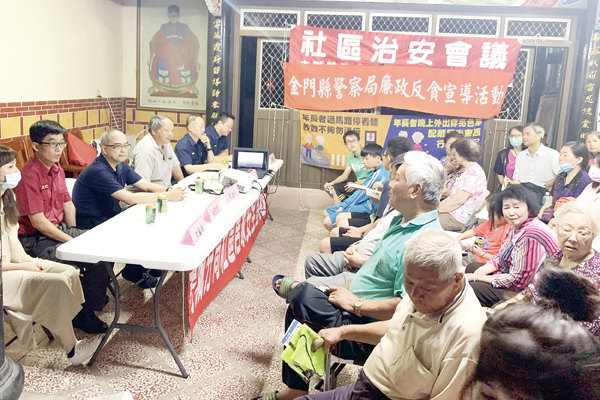 金城後豐港社區召開本年度金城鎮首場社區治安會議,會中透過座談傾聽的方式舉行,聽取民眾對縣政、治安、交通、防災及婦幼安全等多方建言,並以即時回應民眾需求及強化各項警政宣導工作,共同維護社區治安,營造幸福金門,安全宜居城市。 金城鎮後豐港社區守望相助隊在該社區活動中心召開本年度金城鎮首場社區治安會議。會議由後豐港社區發展協會理事長洪榮利主持,出席者有警察局防治科科長翁生乃、刑警大隊組長施仁凱、金城分局副分局長許績俊、第一組組長楊智美、金城派出所所長楊懷璽及縣府各宣導單位:社會處、消防局、財政處等,及社區民眾共計約70餘人,場面熱絡。 年初因為嚴重特殊傳染性肺炎(新型冠狀肺炎)的關係,原訂於每年3月起舉行社區治安會議延至本月始陸續舉行,縣警局為強化社區居家安全,推動「社區居家安全」宣導團,涵括「竊盜」、「詐騙」、「火災」、「家暴」、「性侵」、「毒品」、「兒童、老人意外」、「一氧化碳中毒」等8大面向,主動聯繫社區機關、學校及團體,辦理強化社區居家安全宣導活動,秉持「走入社區、關懷社區、重視社區」之理念,發揮網絡預防效能,共同營造安全友善之社區。宣導團運用社區治安會議或里鄰工作會報、大樓管委會召開區分所有權人會議或住戶大會,及機關學校及團體等舉辦各項集會活動時,宣導民眾增加防竊、防毒、防詐騙、婦幼、交通安全、消防防火、防震、防災、社政防家暴、性侵害、性騷擾、兒少性剝削、老人、兒童等各項知識。金城分局副分局長許績俊表示,落實治安會議是局長張國雄積極推動項目,希望透過會議的舉行能夠傾聽到民眾的意見,另外他也感謝民眾對金門治安與交通的付出,並希望所有縣民和警察都是好朋友、好夥伴,希望大家能做警察局的靠山,杜絕毒品及職業賭場進入金門,以建構安居新環境,落實縣長楊鎮浯打造成安全宜居城市的目標。金城分局表示,本次治安會議主要是透過座談方式,傾聽民眾對縣政、治安、交通、防災及婦幼安全等多方建言,並以即時回應民眾需求及強化各項警政宣導工作。同時也鼓勵社區民眾積極主動參與社區治安工作,以達成治安社區化的目標,共同維護社區治安,營造幸福金門,安全宜居城市。