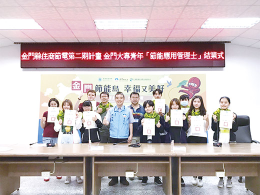金門縣政府19日在大禮堂辦理金門大專青年「節能應用管理士」結業式,建設處長文水成到場鼓勵通過考核並獲頒「節能應用管理士」證書的青年學子,藉著在課堂學到的寶貴知識,盡情揮灑年輕人天馬行空的創意,為打造金門節能低碳島願景付出行動。 縣府建設處在5月15-16日辦理「金門大專青年-節能應用管理士人才培育計畫」課程,在荒野保護協會規劃下,由周玲朱、胡淑嫻專業講師進行授課,2天12小時的培訓課程,除了培養學員節電觀念及節電方法,彼此激盪出創意的節電行動及方案,也提供完善的實習制度及進修機制,讓青年學子透過培育計畫,快速養成節能應用管理的基本能力。 建設處指出,這梯節能生力軍在通過考核後,19日也獲頒「節能應用管理士」證書,後續他們將在校園肩負傳遞環境保護意識及節能減碳觀念的任務,藉以約束青年學子改變用電習慣,減少電力浪費。 建設處表示,金門節能志工隊成立後,除了與荒野保護協會合作,進行人才招募及培訓,也藉由協會志工組織及管理經驗,10年來在全國各地推動節能教育推廣並協助金門志工運作,目前計有24位志工伙伴,是在地推動節電文化不可或缺的一股重要力量。 後續縣府也將賡續招募節能節電志工及辦理相關課程,有意願參與民眾可至FB臉書搜尋「金門節能島‧幸福又美好」瞭解或撥打服務專線:082-321635,將有專人為您說明。