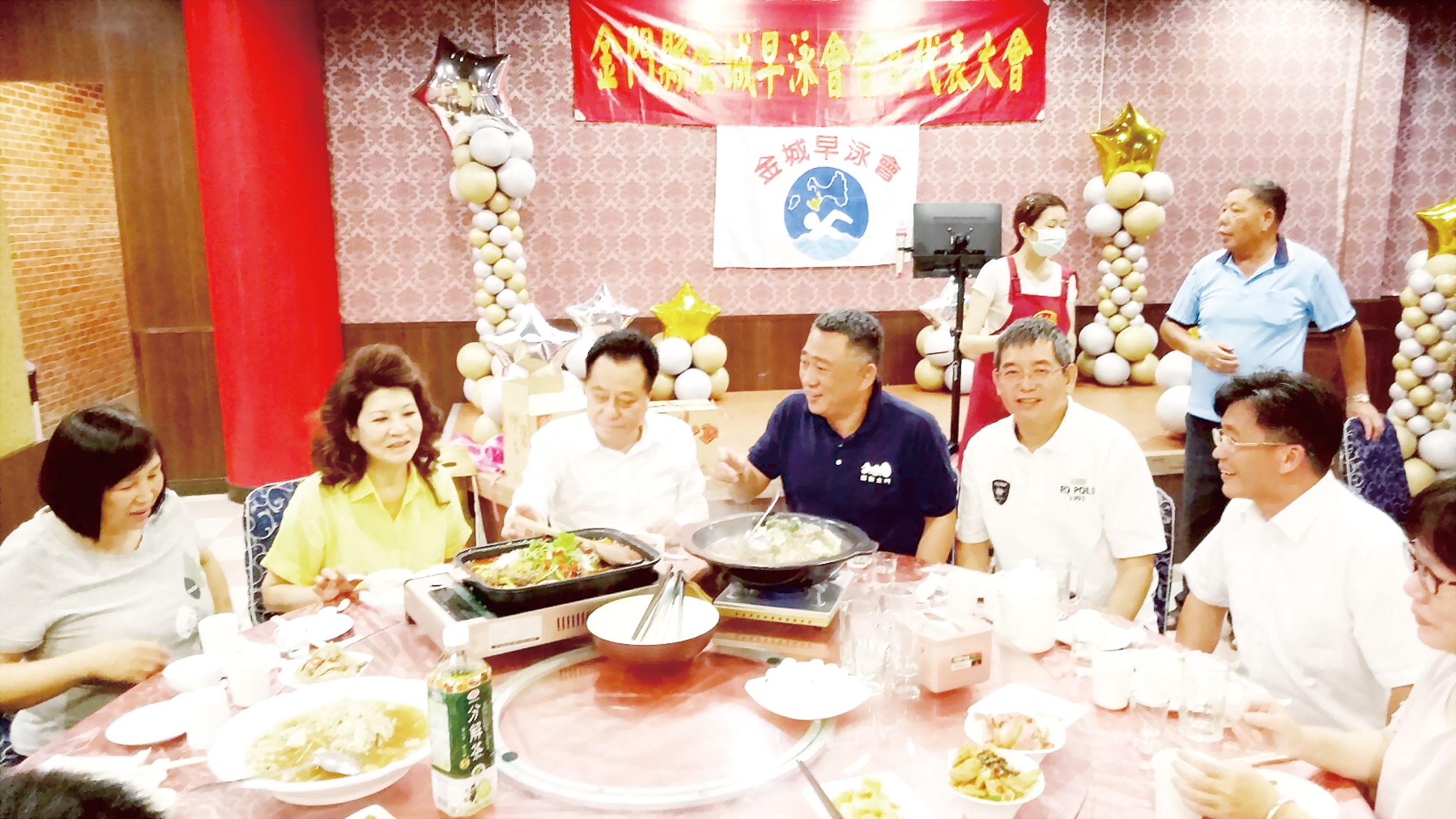 金門縣金城早泳會昨(二十)日晚間召開會員大會,邀集會員們共同與會,針對各項會務進行討論,會後並舉辦餐敘活動,交流情誼。而縣長楊鎮浯與議長洪允典也在稍後到場,向早泳會的會員們致意。 金城早泳會會員大會是在昨日下午約六時左右,在山水間餐廳召開,會員大會由理事長石永城主持,邀集會員們參與討論,會中針對早泳會的各項會務運作,以及會務推動等多項提案進行討論,而會員們也紛紛提出建言與看法。石永城感謝會員們的建言,並表示透過大家的討論也讓早泳會更為成長。 稍後的餐敘活動中,縣長楊鎮浯、議長洪允典伉儷、身兼金門縣體育會理事長的議員唐麗輝、金門縣政府教育處處長羅德水、烈嶼鄉代表會主席方駿洋等人,也到場向大家致意,並與大家寒暄話家常。 縣長楊鎮浯表示,運動是維持身體健康的方式,其中游泳更是一項全身性運動,很值得推廣,對於早泳會致力於游泳推廣表達肯定之意。 議長洪允典向會員們致意,並肯定早泳會在理事長石永城的帶領下會務一定會蒸蒸日上。