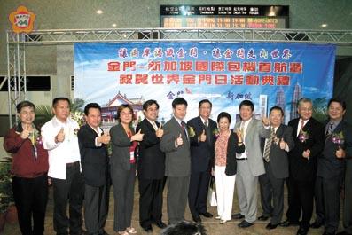 讓兩岸認識金門,讓金門走向世界,金門縣政府繼今年9月19日與旅遊界首度包機自金門直飛澳門,再度啟動國際包機直航新加坡,由訪問團榮譽團長福建省政府主席顏忠誠、團長金門縣長李炷烽帶領議員、鄉鎮長以及地方各界代表一百八十九人,昨晚搭乘復興航空的包機直航新加坡,參加新加坡金門會館擴建竣工慶典暨金門商品文化展,以及在馬來西亞舉辦的第二屆世界金門日等活動,連絡鄉僑情感。由新加坡前來金門的回航包機也於昨晚深夜啟航,載了一百八十八名新加坡與馬來西亞的觀光客,預計於今日凌晨五時許抵金,展開金夏六日遊的行程。 為展現海內外金門人團結氣象,打響金門金字招牌,金門縣各界由省政府、縣議會及縣政府、鄉鎮公所、鄉鎮代表會、農、漁、工、商會等單位、以及地區特產業者23家、宗族文化研究協會、旅台各同鄉會理事長、旅遊相關產業代表及地政士籌組訪問團,再度搭成國際包機直飛新加坡,展開七天的參訪行程,向金門旅外華僑人數最多的星馬,推介特產和旅遊商品。 金門至新加坡首航典禮於昨晚六時三十分假金門航空站大廳舉行,由訪問團團長李炷烽主持,立委吳成典也專程趕回參與首航儀式,議員洪允典、陳玉珍、李沃士、楊應雄、莊良時、許燕道以及副縣長楊忠全、縣府局室主管、金管處處長黃文卿、金門航空站主任王幼琳、承包這一次國際包機業務的復興航空公司總經理孫洪祥和鄉鎮長、鄉鎮代表會主席、各社團代表在場觀禮,共同慶賀繼九月份的金門-澳門國際包機圓滿順利,又啟動了另一條國際航線。 縣長李炷烽感謝復興航空公司不計成本的再度承接這一趟包機業務,也感謝金門縣議會以及縣旅行商業同業公會的協助支持,才能順利促成金門至新加坡的直航。 李縣長表示,地區再度以國際包機的方式,帶領金門鄉親向海外僑胞問候,表達金門鄉親飲水思源的一份情懷,也利用這七天的行程,參加新加坡金門會館慶祝大廈擴建竣工暨第二屆金門商品文化展開幕活動,以及參加在馬來西亞在吉隆坡舉辦的「世界金門日」活動,和參加馬來西亞巴生雪蘭莪金門會館成立60週年慶;訪問期間也將拜訪當地金門僑社。 李縣長說,在金門邁向國際的同時,金門航空站的機場擴充還是有限,期待中央給於金門機場更多的資源,加緊建設的腳步,以符合地方的實際需求。他說,金門走向國際,一次包機、兩次包機,未來有待大家一起努力朝定期航班來實現。 立委吳成典歡喜金門又開闢一條國際包機航線,他希望訪問團成員到新加坡等僑居地,要大力向鄉僑宣揚金門家鄉的好與美,鼓勵華僑第二代、第三代子弟回金門參與投資,一起努力來建設金門家鄉,相信金門未來會有好的發展。 議員洪允典也代表議會致詞肯定金門-澳門以及金門至新加坡的這兩趟直航之旅,他說,國際包機的啟動,會是經濟起飛的轉點,他期待金門邁向國際的同時,愈來愈有發展。 復興航空公司總經理孫洪祥表示:這是金門縣政府與復興航空自九月份的金門-澳門國際包機的合作以來,第二次的國際包機合作案。他說,「金門縣政府積極推廣地方觀光事業,創意行銷策略進入東南亞市場」。復興航空一向與金門縣政府合作無間,希望能繼續配合金門縣政府向國際市場推廣金門觀光,加強為金門鄉親的服務。孫洪祥也贈送飛機模型予縣政府,以及首航的旅客,祝福這一趟首航之旅順利圓滿。 顏主席、李縣長也和隨團的議員洪允典、陳玉珍、李沃士、楊應雄、莊良時以及來賓豎起大拇指,誇讚首航之旅的便利性,期待定期航班的實現。 金門縣訪問團於昨日晚間7點30分搭乘復興航空公司包機自金門尚義機場飛向新加坡,預計深夜一時抵達新加坡樟宜機場,18日清晨返抵金門。該包機也立即會於深夜回航,載了一百八十八名新加坡與馬來西亞的觀光客,預計於今日凌晨五時許抵金,展開金門、小金門三日遊,在搭乘遊輪海運前往廈門、泉州等地旅遊三日,隨即返金門搭乘復興航空包機返回新加坡。 縣府表示,金門有「僑鄉」之稱,旅居海外鄉僑高達74萬人,其中以東南亞的新加坡、馬來西亞、印尼、汶萊、菲律賓居多,這次組團到馬來西亞參加世界金門日活動,以及在新加坡舉辦商品文化展,將有助於凝聚鄉僑的向心力並行銷金門。