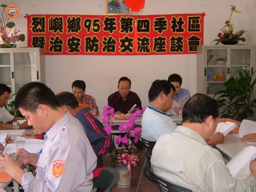 烈嶼鄉95年第4季社區交流暨治安防治座談會議,昨日舉行,鄉公所秘書呂合成代表鄉長林金量感謝各社區發展協會對於各項鄉政建設的支持與配合,希望透過彼此的交流、分享與學習,共同凝聚社區居民相互扶持之向心力,讓烈嶼鄉親生活品質更加精進。 這項會議於昨日下午2時假西宅社區活動中心舉行,鄉長林金量因有公務,由秘書呂合成代理主持,各社區理事長、總幹事出席十分踴躍,烈嶼警察所副所長林中書亦針對治安防治提出宣導,希望與會人員能代為轉知宣導社區居民週知配合與遵守。 呂合成感謝各社區發展協會理事長及其幹部們,帶領社區居民對於各項鄉政建設的支持與配合,如守時活動持續宣導、環境整潔維護及環保政策之鼎力配合等,他希望各社區透過彼此的交流、分享與學習,共同推動社區發展協會各項公共事務之進行,並發揮相互砥礪之精神,共同凝聚社區居民相互扶持之向心力,讓烈嶼鄉親生活品質更加精進。 呂合成也感謝西宅社區發展協會理事長林世在及幹部們,提供會議場地,熱心並協助社區社務的推展等。會中,鄉公所社會課長林長固及承辦人也做業務報告,並進行提案討論,各社區發展協會理事長、幹部也對社區內事務及其管理措施,意見交流與經驗分享。烈嶼警察所副所長林中書也針對轄區狀況、防制詐騙宣導、勤務策進作為及重點工作防制作為等概述說明。