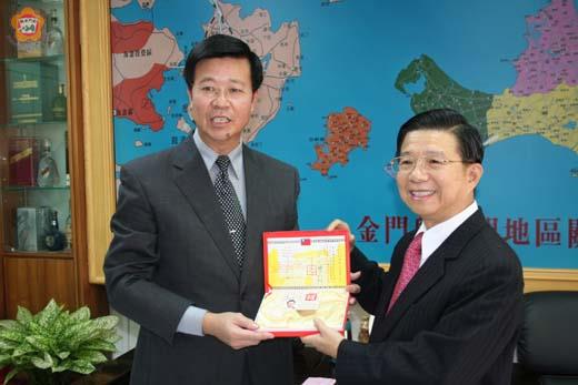 即將卸任的廈門市台商投資企業協會會長吳進忠昨日拜會縣長李炷烽,李炷烽特別頒發榮譽縣民證書,表達對他致力協助推動小三通的感謝。吳進忠表示,將繼續為爭取金門中轉地位而努力。 縣長李炷烽昨日下午頒發金門縣榮譽縣民證書給吳進忠,感謝他對小三通的貢獻。李炷烽表示,吳進忠擔任四年的廈門市台商協會會長,對於小三通及兩岸關係推動,在幕後默默協調、溝通,促成政策形成,使得小三通才能有今天的便利,特別是逢年過節,更突顯重要性,每位走過小三通的旅客都應感謝其貢獻。 但李炷烽也認為目前小三通通道、機場空間都太擁擠,影響政府形象。另外,影響飛安問題的機場戰車壕,三年來都未見交通部、民航局有任何改善,都應檢討。 從廈門經小三通專程到金門接受榮譽縣民證的吳進忠,感謝金門縣政府的禮遇,他指出,二○○三年爆發SARS期間,小三通關閉,造成台商相當大的不便,一直要求重開,突顯出金門和小三通對台商的重要性。 吳進忠也表示,金門在兩岸中有區位的優勢,小三通省時又省錢,現在已身為金門縣的一份子,他將持續奉獻力量,期待金門能取代香港中轉地位,帶動地方經濟發展。