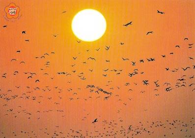 紅日西沈,鸕鶿東歸,滿天黑羽,鋪張揚威! 配合鸕鶿季,金管處發行了一套(十張)明信片,上印有生態作家廖東坤所拍攝的鸕鶿畫面(圖由金管處提供)。這張明信片上圖說為:「大批鸕鶿飛抵夜棲地時,在上空盤旋尋找棲息點。」