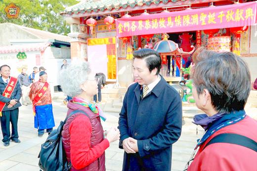 昨(二十七)日為農曆二月初二日,適逢「開浯恩主」唐牧馬侯陳淵的聖誕千秋,縣長陳福海昨日上午率縣府主管前往拈香慶賀,敬獻爐敬金,祈求「開浯恩主」護佑浯島子民安居樂業,風調雨順,縣運昌盛。下午牧馬侯陳淵的轎輦與廟內供奉王爺神輦等也繞境巡安,村內氣氛熱鬧非常。 金門各界公祭牧馬侯陳淵聖誕祭典活動昨日上午9時在金城鎮庵前「牧馬侯祠」舉行;縣長陳福海擔任主祭,庵前村長老陪祭,議員陳滄江、李誠智、縣府秘書長林德恭與縣府主管等人與祭,陳縣長依循古禮向「開浯恩主」神像上香、獻花、獻爵、獻饌、獻果品、宣讀祝文、獻金帛後,率與祭人員行三鞠躬禮致敬,並致獻爐敬金,祈求風調雨順、國泰民安。 祭禮過後,陳縣長也親切地和長老、鄉親一一握手致意、話家常,聽取對於地方建設的建議,受到鄉親們的熱烈歡迎。 立委楊鎮浯、金城鎮公所主任秘書黃耿銘、金寧鄉代表會主席陳成泉等人也率員前往敬拜牧馬侯陳淵,並敬獻爐敬金慶賀,祈佑神威澤被浯島子民、平安順利。 庵前村為慶祝恩主公牧馬侯聖誕,從前天起一連二天建醮祈福,廟方管理委員會主委陳昭柏與陳水員等長老與村內民眾也熱心投入慶典活動,社區居民家家戶戶在門前擺設香案祭拜,以表達對恩主公崇敬之意,村民與信眾也準備祭品前往廟內上香膜拜,以祈求恩主公神威顯赫、庇佑閤家平安。 昨日下午二時三十分左右,牧馬侯陳淵的轎輦與廟內供奉王爺神輦共同繞境巡安,而賢厝泰安宮神明、南門天后宮步馬陣、還有電音三太子等陣頭也到場逗熱鬧,炒熱廟慶熱鬧氣氛。 值得一提的是庵前村女兒陳淑昭與夫婿宋浩,每一年的恩主公聖誕都會遠從桃園回金門來參與慶典,每一年都供齋,已經連續第十八年,對於二人的虔誠之心,縣長陳福海也表示敬佩,並和他們合照留念。 縣府民政處指出,唐德宗貞元年間,牧馬監陳淵率蔡、許、翁、李、張、黃、王、呂、劉、洪、林、蕭等十二姓族人,渡海前來浯洲(金門)開墾,活動範圍在今日庵前一帶。爾後,鄉人結草庵供奉其神像,視為護驥將軍。相傳,元末倭寇進犯,陳淵顯靈護民,朝廷乃於庵前豐蓮山賜建七進廟宇崇祀,名「孚濟廟」,並封為福佑聖侯,居民又稱恩主公、聖侯恩祖。由於陳淵成為金門地域信仰的代表神祇,金門其他地方亦建有孚濟廟供奉之;同時,清中葉以降遠渡南洋的鄉僑,也將陳淵及其部屬帶到異鄉,在同鄉會館奉祀,作為精神慰藉的象徵。