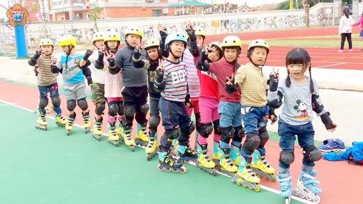 古寧國小直排輪於去年底成軍,廣受全校小朋友的青睞,這學期排入週五的學校特色課程,在校園各角落處處可見學子溜直排輪的身影,成為全校運動。古寧國小校長黃芸芸希望將直排輪這項好的運動推廣出去,讓更多大小朋友愛上這項充滿速度感的運動,溜得開心。同時讓孩子四肢更協調,體適能也進步。 古寧國小的運動發展素來以桌球、田徑稱著,由於去年金門縣補助金門大學院校基金的挹注,學校開始思考以學生需求為導向,試圖發展一系列學生熱愛學習的課程,而直排輪為孩子們的首選。 校長黃芸芸指出,古寧國小的直排輪於105年11月成軍,由一、二年級的小朋友開始啟蒙,志願報名學生達二十八人,由本校體育專長黃現足老師擔任教練,學校提供直排輪鞋、安全帽、護具等,利用一、二年級每週五下午不上課時間兩小時進行直排輪教學,同學們著好裝備繞著校園操場滑行,偶爾學子跌倒,不過因為興趣、因為喜歡,仍奮力爬起繼續往前。從最基本的直排鞋的穿法、安全的防護、平衡感的訓練開始學起,進而教導直排輪技巧,包括:重心置換、壓軔練習、蹲下起立、V字型、滑行跳躍、踏步轉彎、雙腳S前溜、腳跟煞車、後退、彈跳等,甚至偶爾還配合音樂節奏,讓直排輪也能像舞蹈一樣也能展現肢體流暢的力與美。 黃芸芸表示,古寧直排輪自成軍以來,廣受全校小朋友的青睞,經過兩個月的練習,受邀在金大成果發表會上佳評如湧,來賓讚譽有加,也受到家長的肯定,因而本學期排入週五的學校特色課程,推廣至三到六年級的小朋友選社學習,成為全校運動。現在無論在校園角落或是籃球場上,經常在假日或放學後可以看見古寧的學子溜直排輪的身影,歡笑聲盈滿校園,親子同樂,成為孩子們的最愛。 黃芸芸進一步表示,「運動會使小孩更聰明」這是經過研究而得到證實的理論。直排輪運動可以鍛鍊孩子們的體能,提高平衡感、運動感、體力、持久力等,幫助成長期間孩子們的生長發育,在室外與更多的人一起運動會使性格變得開朗,也可以做休閒、競速、特技、花式、平地花式等等,取代步行,能體會輕盈奔馳的快感。所以秉持教育的「養樂多」哲學,就可以透過學校直排輪的教學活動,讓孩子們在學習中找到興趣,培「養」專注合作的態度,「樂」在學習、「多」元發展。
