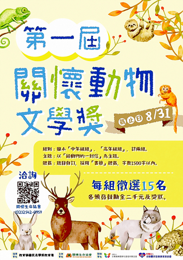 由教育部國民及學前教育署指導、社團法人中華民國關懷生命協會主辦的「關懷動物文學獎」徵文活動開跑囉,自即日起至今年8月31日止(郵戳為憑),歡迎國小三至六年級學生,寫下自己的動保觀點或經驗,以線上報名或郵寄報名的方式,將作品寄到關懷生命協會的電子信箱或會址。信箱edu@lca.org.tw,地址10467台北市民生東路二段120號3樓關懷生命協會。 今年關懷生命協會首度舉辦「關懷動物文學獎」,希望鼓勵學生閱讀動保議題的課外讀物,寫下自己的動保觀點或經驗,增加學生學習動保教育的主動性,提高學習動機並激發自主思考。期望藉由舉辦「關懷動物文學獎」,將動保價值結合文學創作,引起學生主動思考體會動保價值的興趣,也鼓勵學生和師長共同分享討論。由學生書寫自己的動保觀點或經驗,並徵選優秀作品登載於本會「動保扎根教育平台」網站,讓更多師生及社會大眾共同欣賞作品,並啟發省思。報名資格為全國各縣市公私立國民小學三至六年級學生,分為「中年級組」(國小三、四年級學生)、「高年級組」(國小五、六年級學生)。以「給動物的一封信」為主題,學生可以結合自身經驗或運用想像力,選擇給某一位或某一種動物書寫一封信,並嘗試連結動物保護、愛護生命等觀念想法。題目自訂,採用「書簡」體裁,字數1500字以內。請以直式橫書繕打,內文新細明體14號,固定行高25pt。如以郵寄紙本報名,請採A4紙張雙面列印。如以手寫的方式,請以600字稿紙繕寫、使用黑色或藍色原子筆、字跡清楚、不可使用注音。 線上報名者,每名報名者限投一份稿件,作品一律不可抽換或退件;請將報名表及作品word電子檔email至edu@lca.org.tw,主旨「參加關懷動物文學獎國小中/高年級組」。郵寄報名者,每名報名者限投一份稿件;應徵作品恕不退件,請報名者自存底稿;參選稿件上請勿書寫作者姓名,亦不得加註任何記號;請詳細填寫報名表一份,連同作品一式四份,於期限內掛號郵寄至「關懷生命協會」,地址10467台北市民生東路二段120號3樓,並於信封上註明「參加關懷動物文學獎」及「組別」。 「中年級組」及「高年級組」分別徵選15名,每名錄取者頒發鼓勵金二千元整及獎狀。主辦單位將邀請文學、教育、動保領域專家學者組成評選小組評審之,作品如均未達水準,得由評審小組共同決議不足額入選。評審標準包含,主題取材及價值啟發性40%、文字表現及創意豐富性40%、組織結構及標點錯別字20%。 詳細活動簡章及報名表請見網址:https://awep.org.tw/online-submission.html,活動洽詢:(02)2542-0959陳立珊。