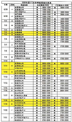 金門縣衛生局與高雄建佑醫院合作辦理乳房X光攝影檢查及子宮頸抹片檢查活動,6月29日起至7月21日將結合各鄉鎮衛生所辦理健康篩檢服務,這項由政府補助的免費健檢,提供的篩檢項目有乳房攝影檢查:45歲-69歲婦女,每2年1次;子宮頸抹片檢查:30歲以上婦女,每年1次;糞便潛血檢查:50-74歲民眾,每2年1次。 縣衛生局提醒婦女朋友可把握難得機會,攜帶健保卡,穿著輕便服裝或裙裝至設站地點進行篩檢服務,為自己身體健康把關,同時也呼籲大家帶著婆婆、媽媽、左鄰右舍一起關心自身健康,踴躍接受這項免費健康檢查服務。 這項健康篩檢活動,相關行程可上衛生局、縣府網站查詢,或洽詢金城鎮衛生所325059、金湖鎮衛生所336662、金寧鄉衛生所325735、金沙鎮衛生所352854、烈嶼鄉衛生所362078、金門縣衛生局330697-715黃小姐。