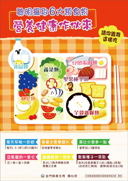 「聰明吃,營養跟著來」,為協助民眾落實均衡飲食之健康生活型態,以更簡單的方式,輕鬆達到均衡飲食,金門縣衛生局鼓勵大家一起將國健署推出的「我的餐盤」活動,落實於日常生活中,讓滿滿的營養做為家庭幸福最穩固的後盾。衛生局指出,現代許多人的生活趨於靜態,常常攝取過多的熱量,營養卻不均衡,導致肥胖、慢性病包括心臟病、癌症、糖尿病及高血脂症等罹患率上升,「均衡飲食」的目的,即是為了減少一般人微量營養素缺乏的問題,並預防上述的疾病。 衛生局表示,均衡飲食是每天都要均衡的攝取六大類食物,包括全穀雜糧類、乳品類、豆魚蛋肉類、蔬菜類、水果類及油脂與堅果種子類,要簡單的將均衡飲食概念落實在生活中,可以參考「我的餐盤」的圖示及口訣,圖示中可以看得出每個食物種類的比例,如果每餐都能達到建議的標準,飲食上大致就能均衡。 我的餐盤六口訣: 1、每天早晚一杯奶:每天早晚各喝一杯240毫升的乳品,或是用起司、無糖優酪乳等方式增加乳品類食物之攝取。 2、每餐水果拳頭大:1份水果約1個拳頭大,切塊水果約大半碗~1碗,1天應至少攝取2份水果,並選擇在地、當季、多樣化。 3、菜比水果多一點:青菜攝取量應足夠,體積需比水果多,並選擇當季且深色蔬菜需達1\3以上(包括深綠和黃橙紅色)。 4、飯跟蔬菜一樣多:全穀雜糧類之份量約與蔬菜量相同,且盡量以「維持原態」之全穀雜糧為主,或至少應有1\3為未精製全穀雜糧,例如糙米、全麥製品、燕麥、玉米、甘藷等。 5、豆魚蛋肉一掌心:蛋白質食物1掌心約可提供豆魚蛋肉類1.5~2份,為避免同時吃入過量不利健康的飽和脂肪,選擇這類食物之優先順序應為豆類>魚類與海鮮>蛋類>禽肉、畜肉,且應避免加工肉品。 6、堅果種子一茶匙:每天應攝取1份堅果種子類,1份堅果種子約1湯匙量(約杏仁果5粒、花生10粒、腰果5粒),民眾可於一天內固定時間攝取足1湯匙量,或分配於3餐,每餐1茶匙量(1湯匙=3茶匙)。衛生局也提醒大家,依照「我的餐盤」均衡飲食圖像和口訣,落實於日常生活當中,聰明攝取六大類食物,營養健康自然作伙來。