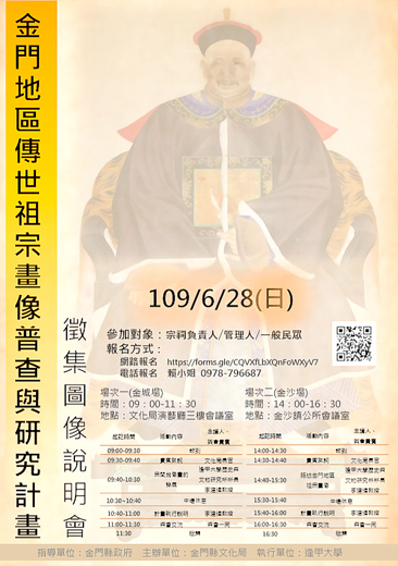 金門縣文化局委託逢甲大學歷史與文物研究所李建緯教授,從109年6月開始針對金門地區的傳世祖先畫像,進行詳細的辨識、分析與調查研究。6月28日(週日)上下午於金城鎮、金沙鎮各舉辦說明會一場,歡迎民眾踴躍擇一報名參與,即日起至6月23日截止。報名電話請洽:逢甲大學賴小姐0978-796687、報名網址https://forms.gle/CQVXfLbXQnFoWXyV7。 金城場時間為6月28日(週日)上午9時30分至11時30分,地點在文化局演藝廳三樓會議室;金沙場時間為6月28日(週日)下午2時30分至4時30分,地點在金沙鎮公所會議室。說明會中將針對祖宗畫像所蘊含的歷史、藝術、文物保存等相關問題進行討論,也歡迎鄉親踴躍提供家族中的祖先畫像圖像一同參與此次調查研究計畫。 文化局表示,根據《臺灣民俗文物辭典》中的說法,中國人的家族觀念濃厚,所以在祖先過世後,便會請匠師捏塑祖先型像或請畫師畫下祖先或亡者的型象,供後代子孫憑弔與追思,認為這是兼善天下的基礎。表現在親人之間的「孝悌」行為,延伸至對於已逝親長的「慎終追遠」,因此在祖先牌位的奉祀之外,也敬謹的追憶留下祖先容顏,定期禮拜追思,藉此告誡子孫遵循祖訓,無有罔過。這些畫像稱為「祖先像」。 金門的知名藝術家吳鼎仁就其個人豐富的古書畫收藏,及遍觀全島的字畫作品,歷二十多年考證鑑定出版《金門古書畫藝術》專書,書中專章提及:「祖先官像畫是中國人物畫當中,最特殊之美學表現。工筆描繪,隨類賦彩,文官、武官依官服章黼禽獸之類別,可分出官階品位,以彰先人德業。亦有著常服,優遊園庭堂之日常生活寫照,『曹衣出水,吳帶當風,傳神寫影,盡在阿堵之中』。畫像又稱玉照、肖像、寫真,畫者多不具姓名,歷久常不知畫者與被畫者是誰。金門世家多有供奉祖像,如:蔡厝有明代蔡復一像,年屆清明始掛於家廟,祭拜即收。金門先祖肖像畫之多,散見於各世家珍視,不勝枚舉,保存不易,亦甚多焚毀。」 金門的聚落大部份為單姓村,地區對祖先慎終追遠的傳統為家族凝聚的力量,為能使這些重要的文物遺產在金門得到良好的保存與紀錄,金門縣文化局特委託逢甲大學歷史與文物研究所李建緯教授,從109年5月開始,進行「金門地區傳世祖宗畫像普查與研究計畫」案,冀望透過調查研究計畫的進行,逐一審視分析金門各地宗族的發展軌跡,期許透過這項研究案為各祖先畫像建立相關研究資料與檔案,另將舉辦祖先畫像保存工作坊,讓民眾與專家學者一同探討這些祖先畫像的保存問題與解決方法。同時,也將出版該計畫之調查研究成果,並舉行成果發表會與記者會,讓這些具有深刻歷史、藝術、文化意義的祖先畫像,透過普查與研究建立資料庫,進一步教導民眾如何保存這些傳世的金門縣文物,得到最好的保存方式。